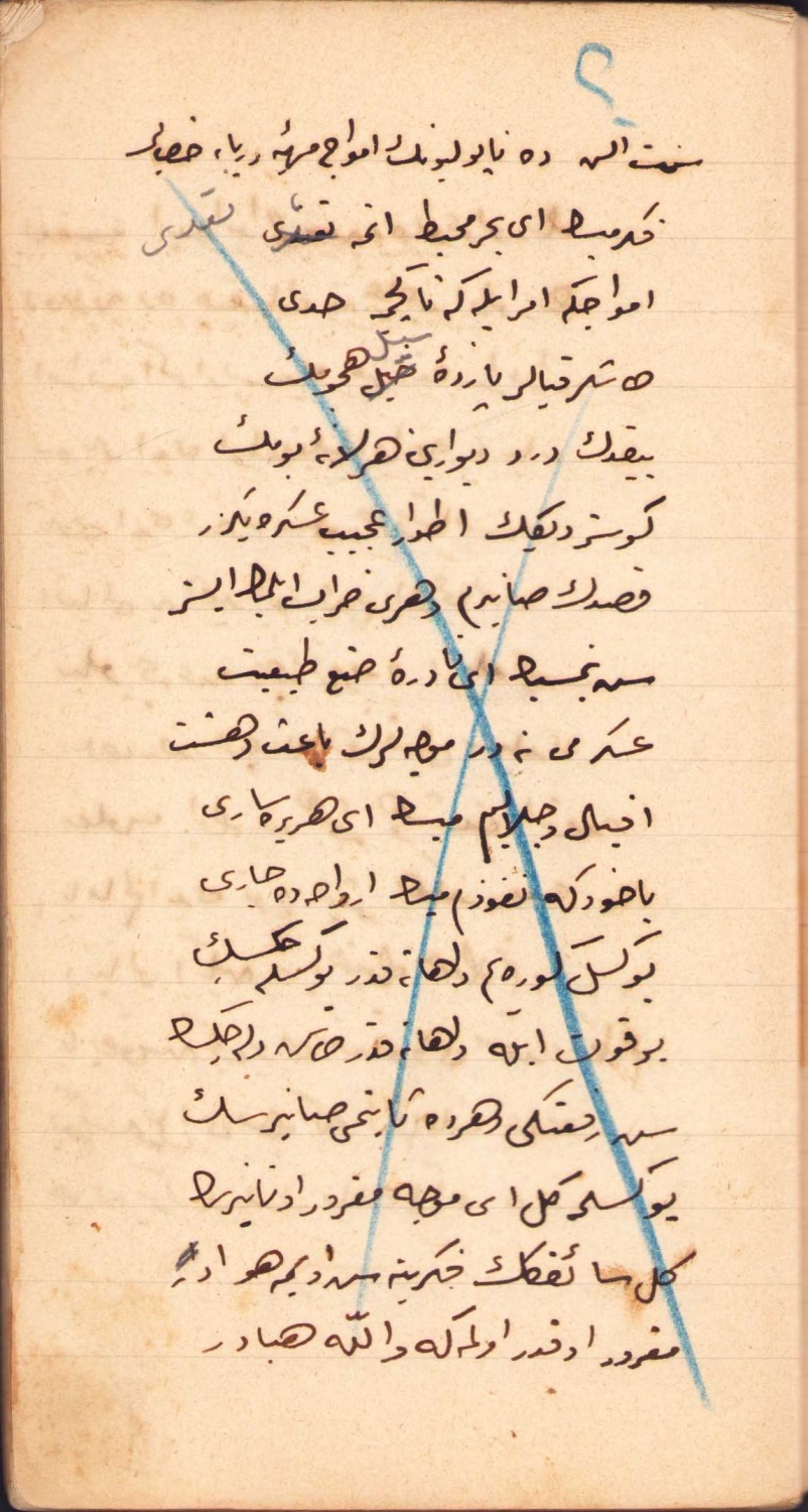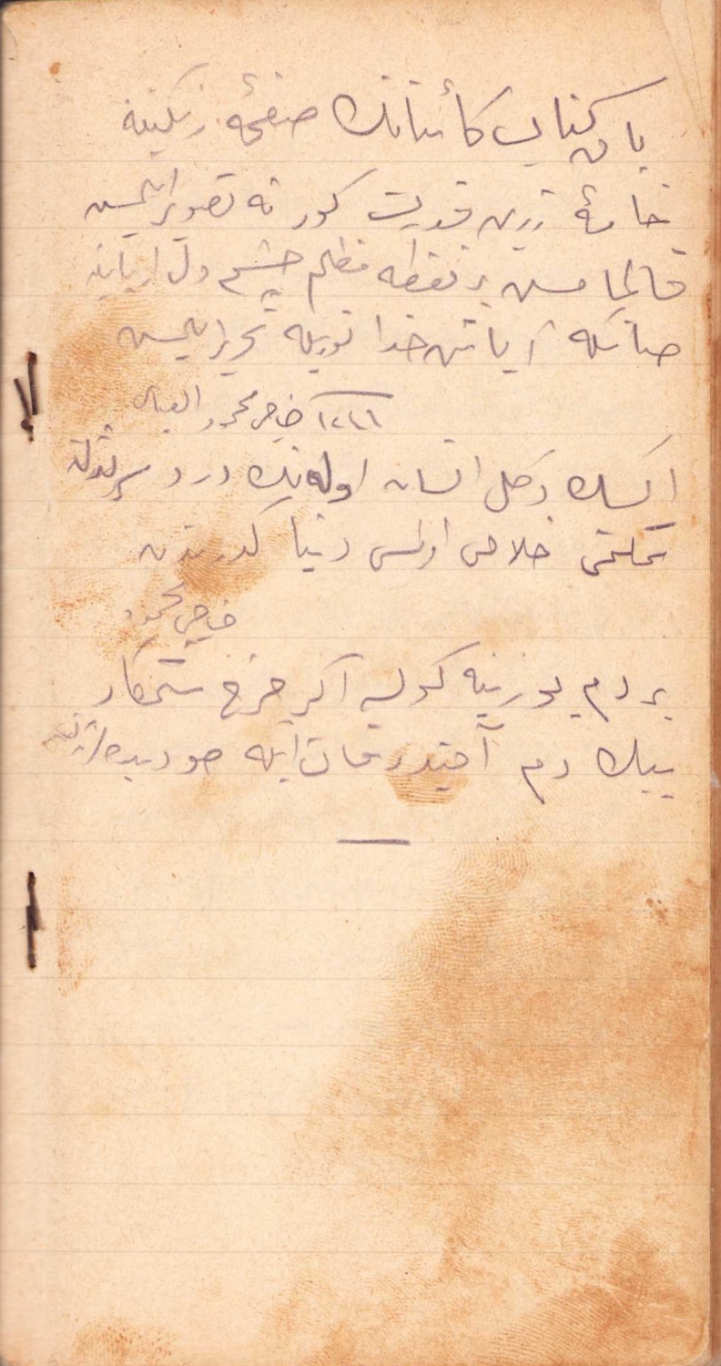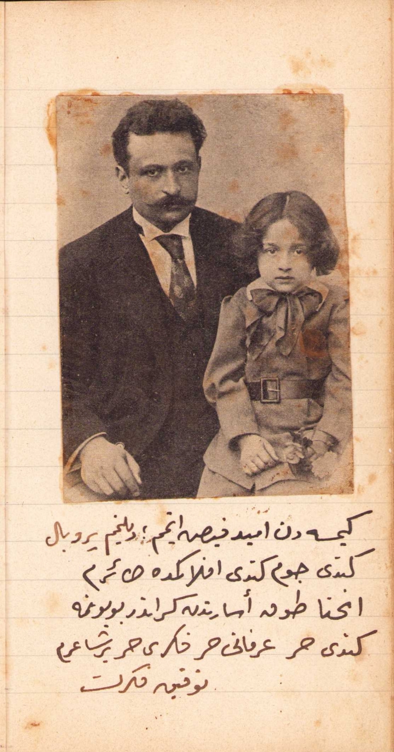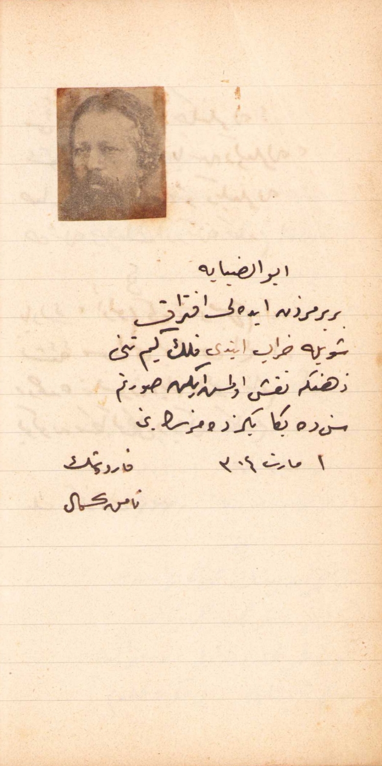 Osmanlıca edebiyat defteri, Namık Kemal ve Tevfik Fikreti'in fotoğraflarının altına yazılmış mısraları vardır. 100 sayfa, 9x19 cm