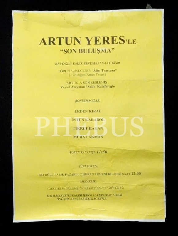"ARTUN YERES´le Son Buluşma" töreni duyuru afişi, tören sunucusu: Âlin Taşçıyan, konuşmacılar: Erden Kıral - Üstün Karabol - Fikret Hakan - Murat Akman, 42x30 cm