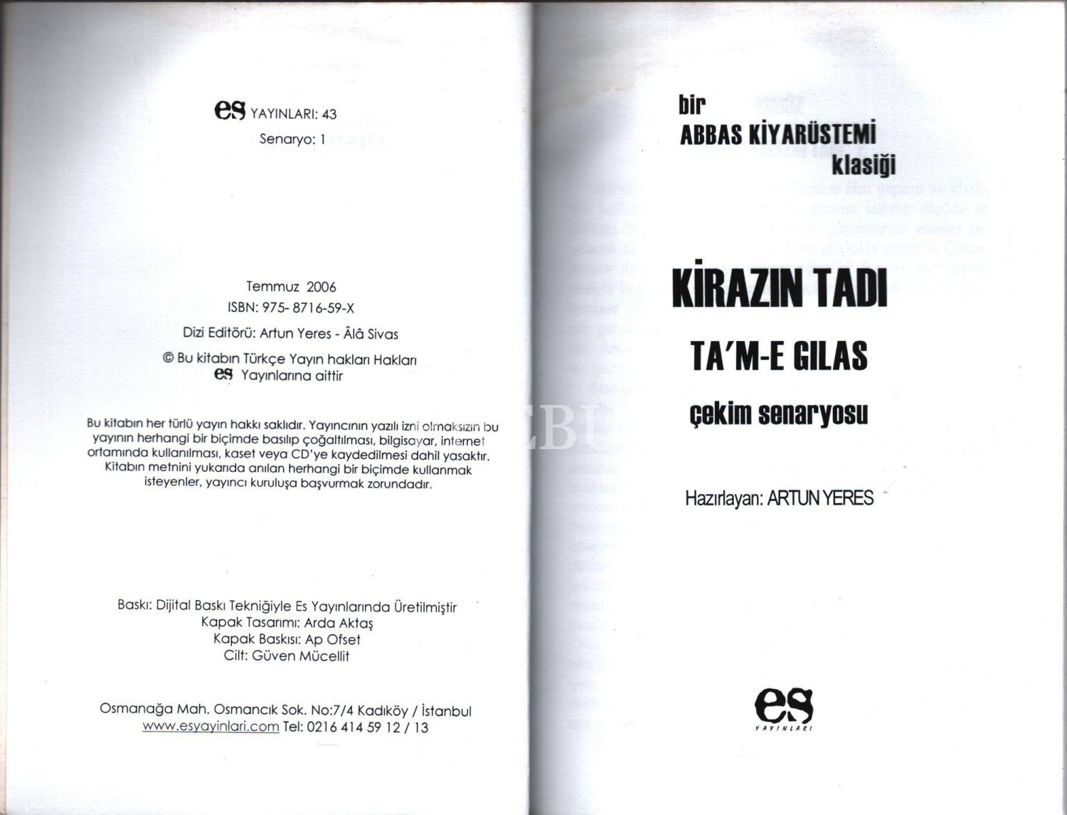 "Bir Abbas Kiyarüstemi Klasiği" KİRAZIN TADI (TA´M-E GILAS) ÇEKİM SENARYOSU, hazırlayan: Artun Yeres, Es Yayınları, 97 sayfa, 14x20 cm