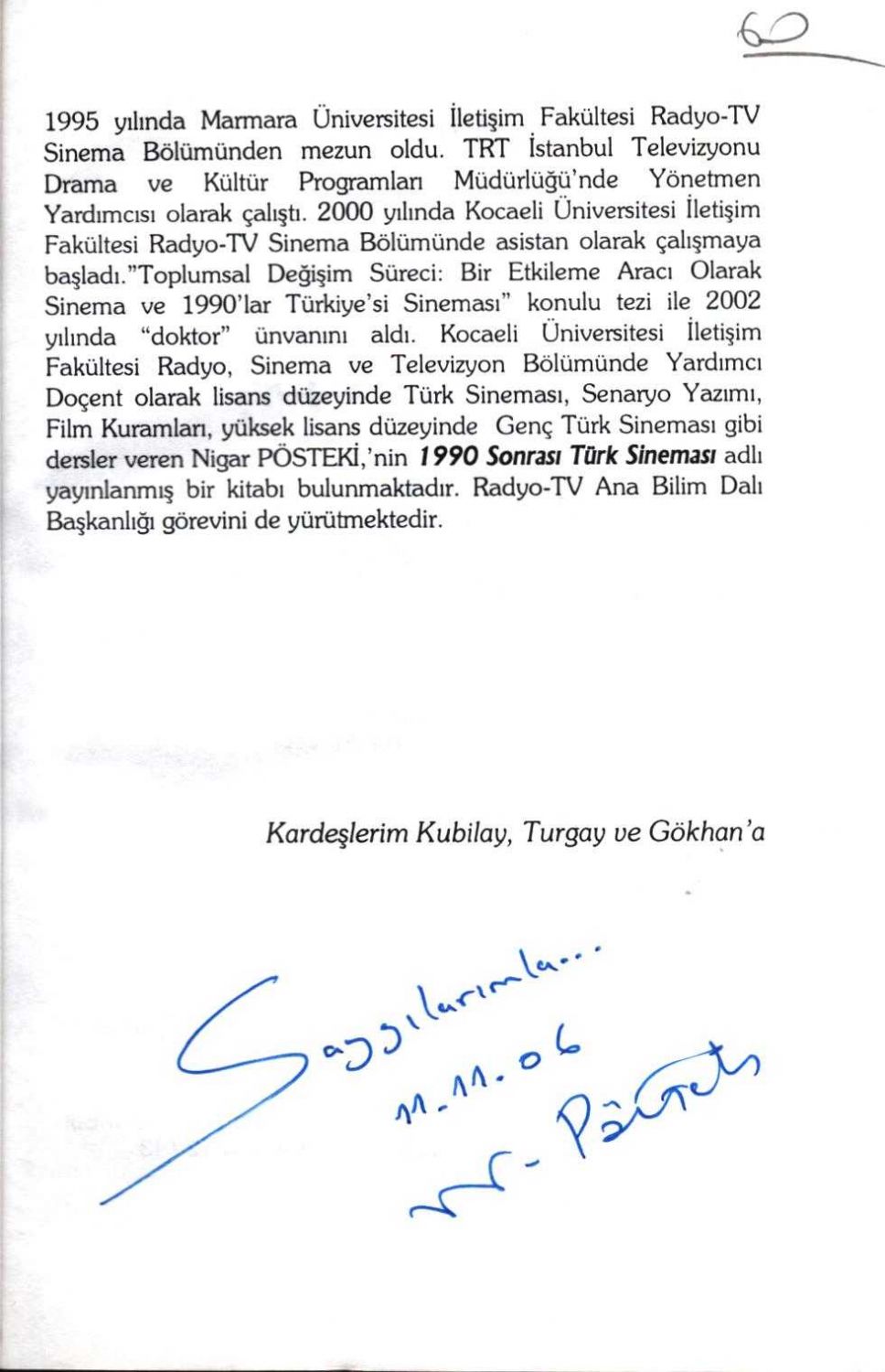 İthaf, "Saygılarımla... 11.11.06 N. Pösteki" şeklindedir.
