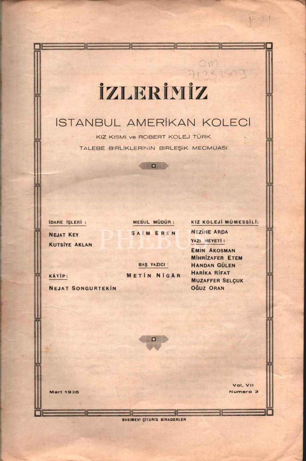 İZLERİMİZ: İstanbul Amerikan Koleci Kız Kısmı ve Robert Kolej Türk Talebe Birliklerinin Birleşik Mecmuası, Çituris Biraderler, Mart 1936 - Vol. VII (Numero 3), 34 sayfa, 20x28 cm