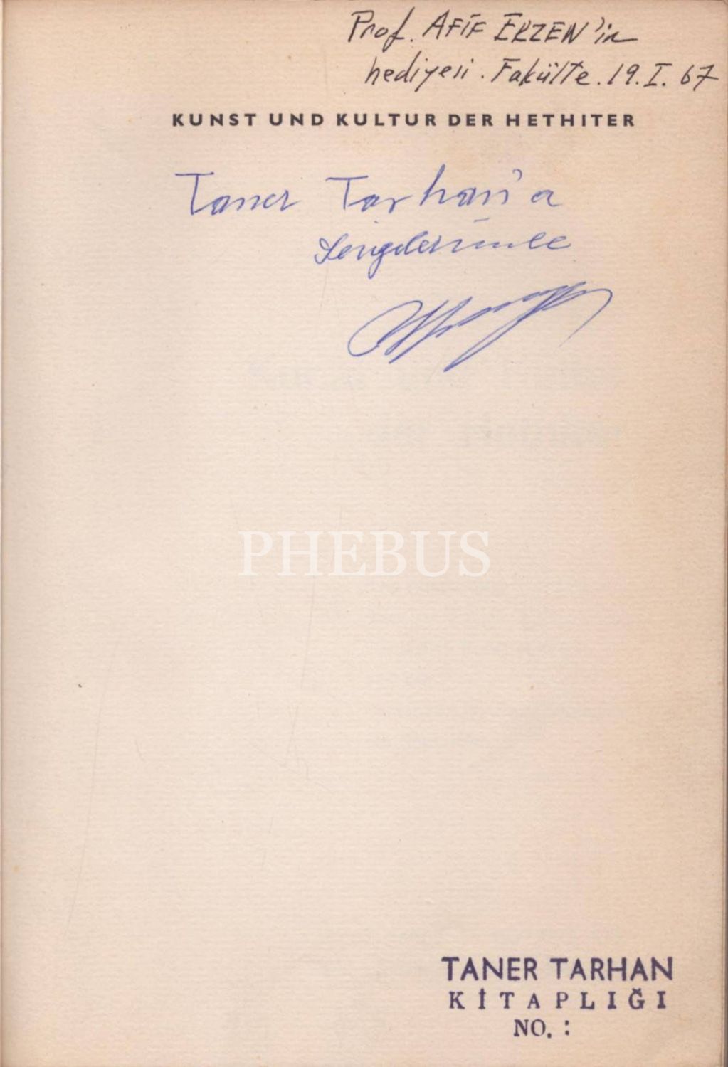 Kitap, Prof. Afif Erzen tarafından "Taner Tarhan´a sevgilerimle." ifadeleriyle ithaflanmış, Taner Tarhan tarafından da "Prof. Afif Erzen´in hediyesi. Fakülte. 19.I.67" notu düşülmüştür.