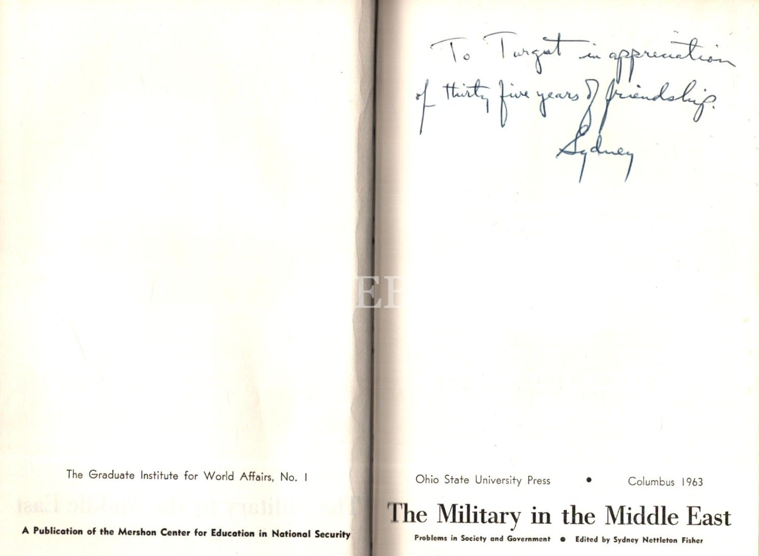 Sydney Nettleton Fisher´dan ithaflı ve imzalı THE MILITARY IN THE MIDDLE EAST, Ohio State University Press, Columbus - 1963, 138 sayfa, 15x22 cm