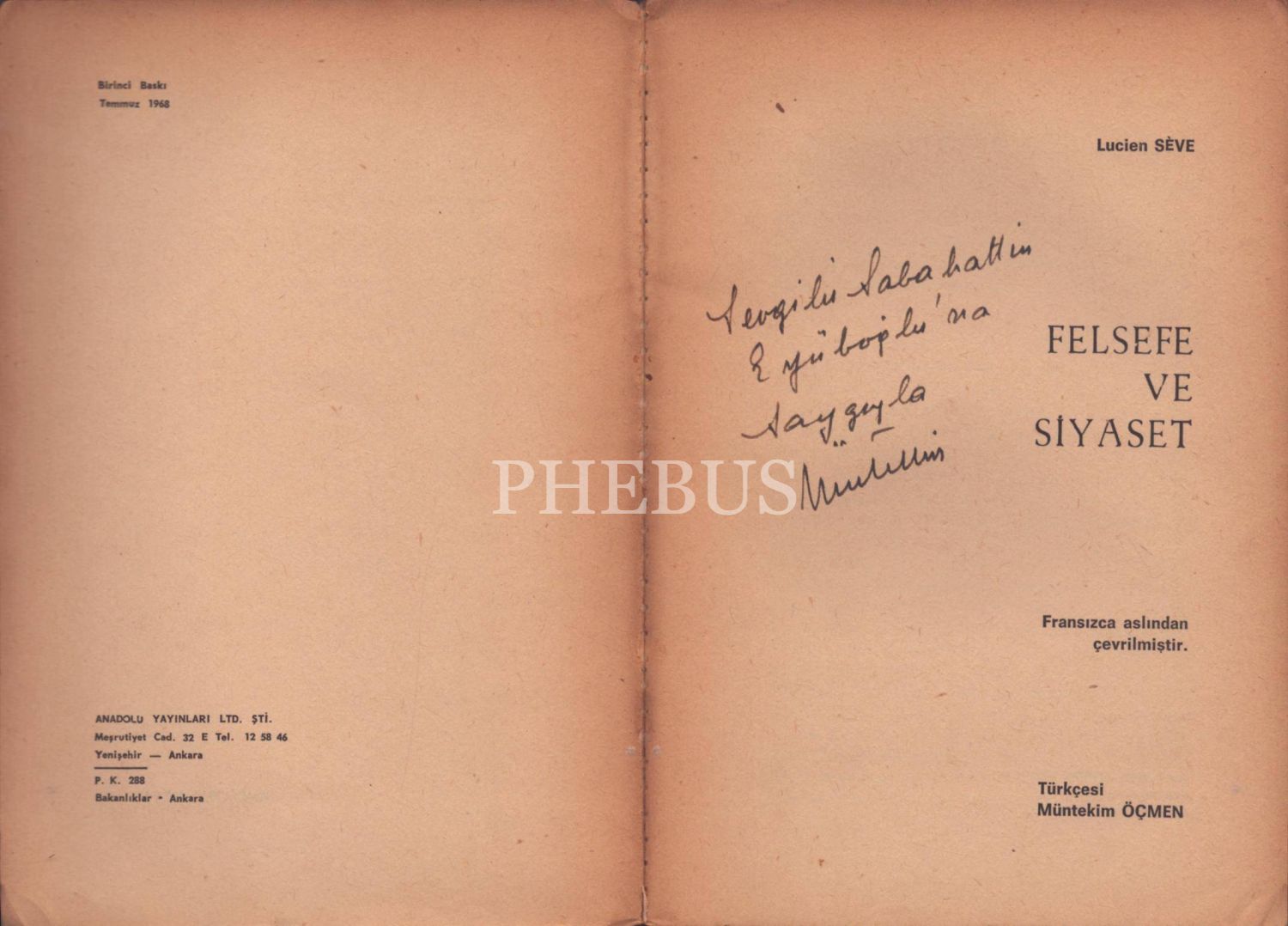 Çeviren Müntekim Öçmen´den Sabahattin Eyüboğlu´na ithaflı ve imzalı FELSEFE VE SİYASET, Lucien Seve, Anadolu Yayınları, Temmuz 1968, 167 sayfa, 14x20 cm