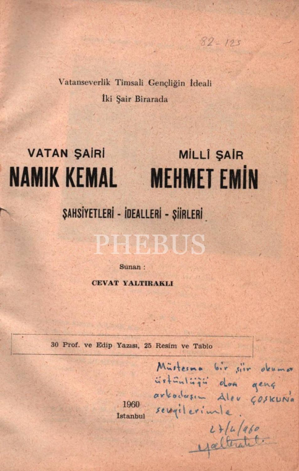 Cevat Yaltıraklı´dan Alev Coşkun´a ithaflı ve imzalı VATAN ŞAİRİ NAMIK KEMAL - MİLLÎ ŞAİR MEHMET EMİN (Şahsiyetleri - İdealleri - Şiirleri), İstanbul - 1960, 252 sayfa, 14x20 cm