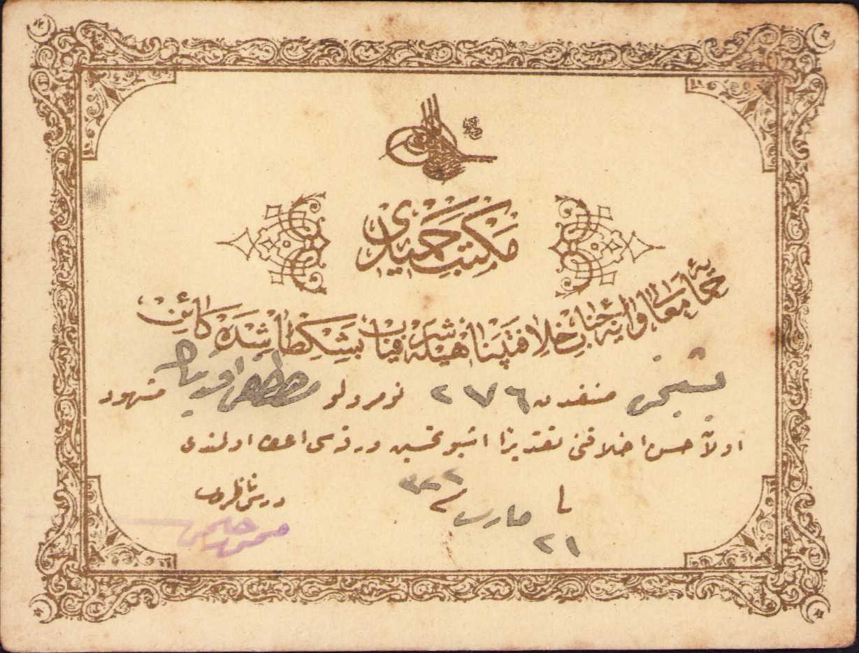 Osmanlıca Hamidiye belgesi, Beşiktaş Mektebi 5. sınıf Mustafa Efendi, 1322, 10x8 cm.