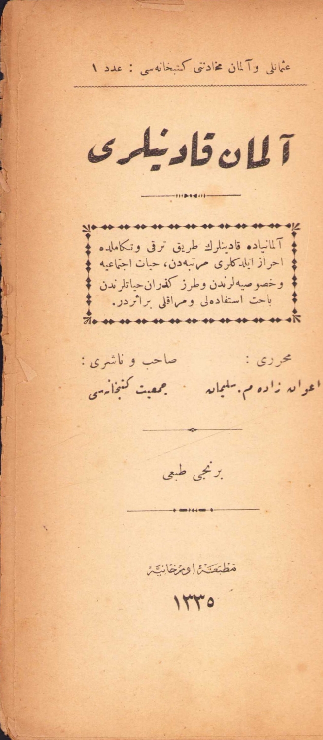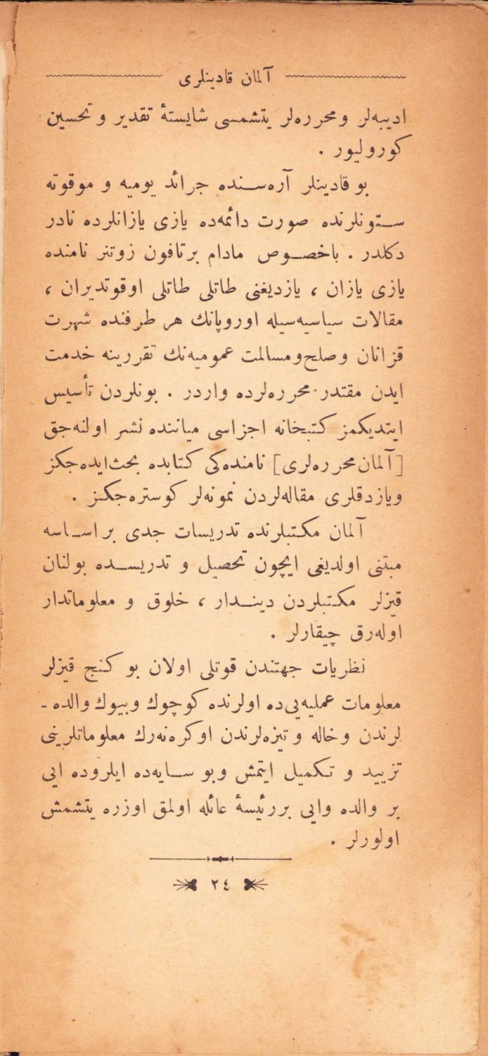 Osmanlıca Alman Kadınları, Avanzade Mehmed Süleyman, birinci baskı, Orhaniye Matbaası, 1335, 24 sayfa, 10x20 cm.