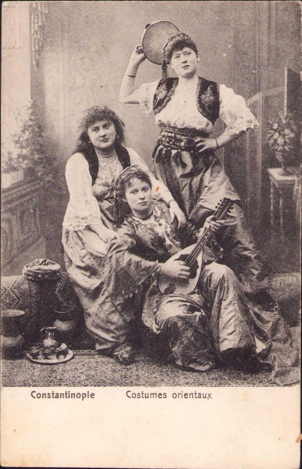 Osmanlı dönemi oryantal kostümlü kadınlar, Constantinople. Editör Au Bon Marche, Pera.