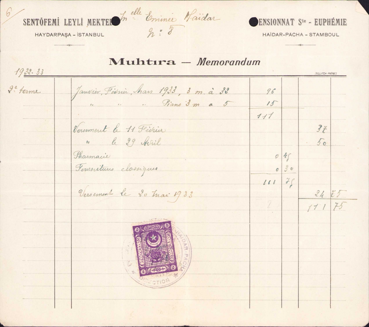 Fransızca - Türkçe iki dilde Sentöfemi Leyli Mektebi, Haydarpaşa - İstanbul antetli muhtıra, 1933 tarihli, 22x19 cm.