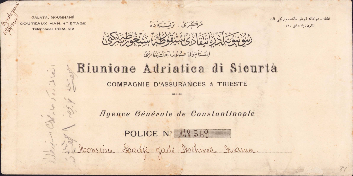 Osmanlıca - Fransızca Ruiunione Adriatica di Sicurta Sigorta Şirketi, Constantinople antetli zarf, 27x13 cm.