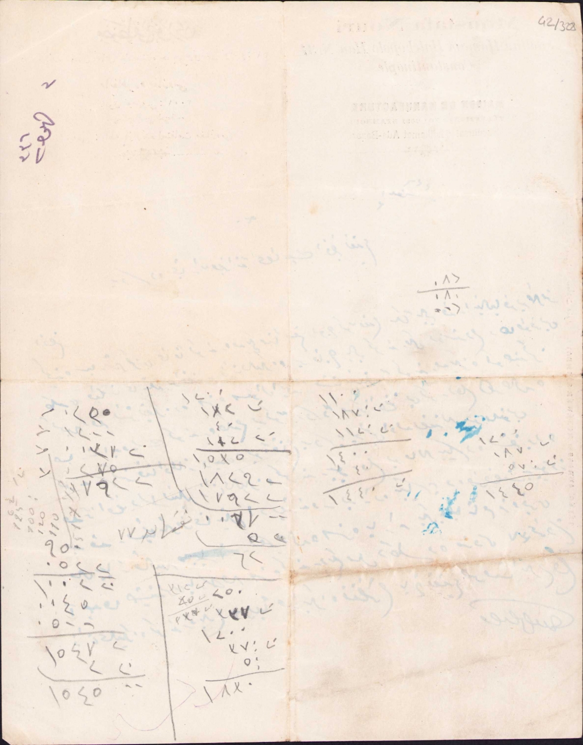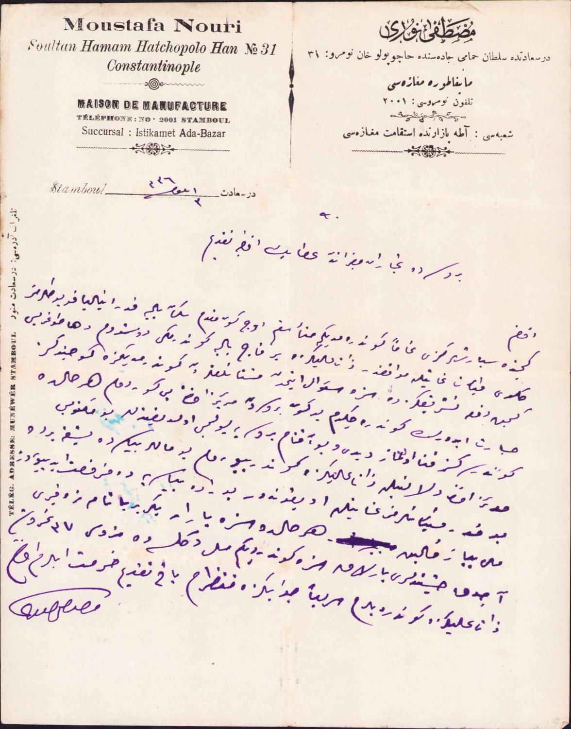 Osmanlıca - Fransızca Mustafa Nuri Manifatura Mağazası, İstanbul antetli doküman, 25x20 cm.