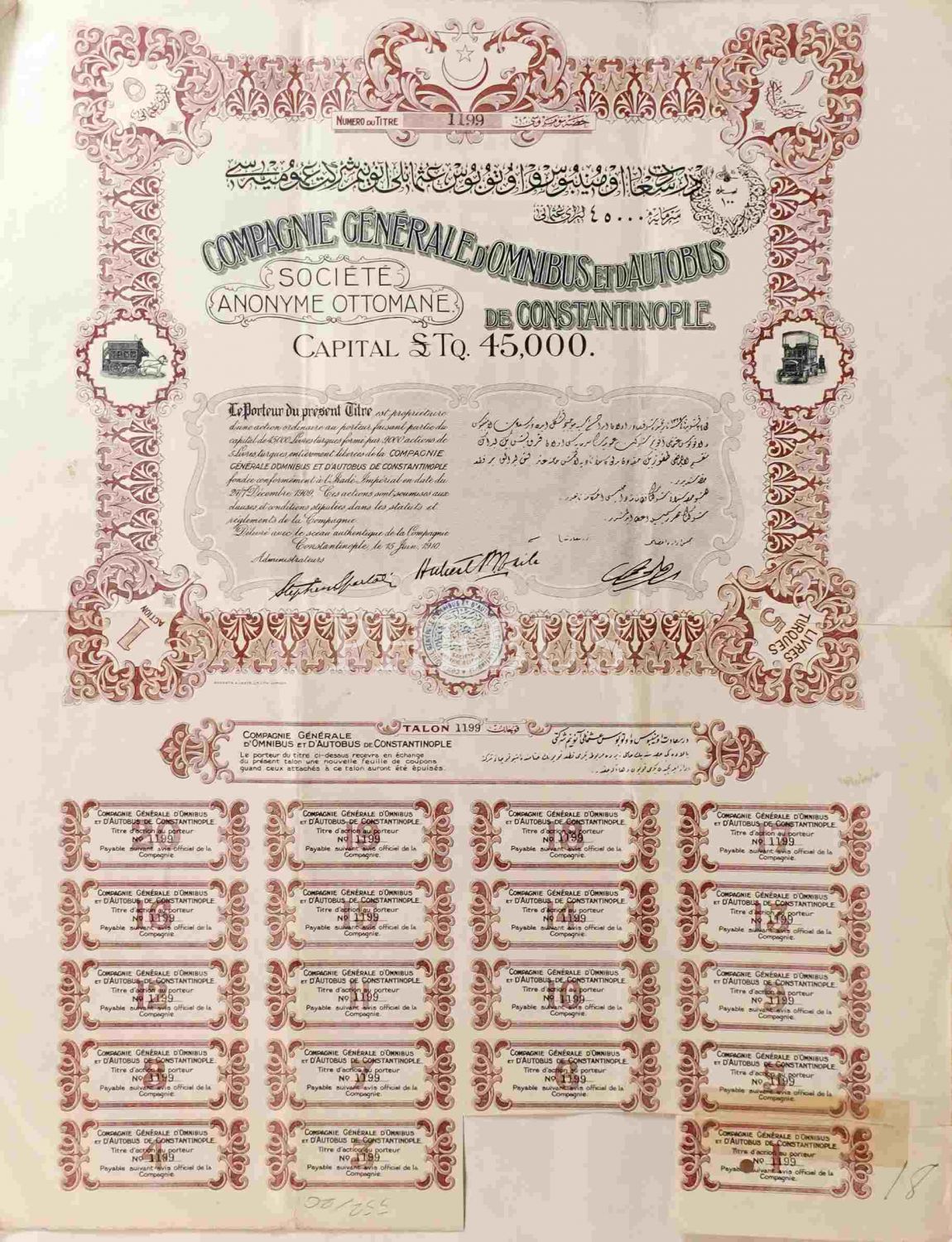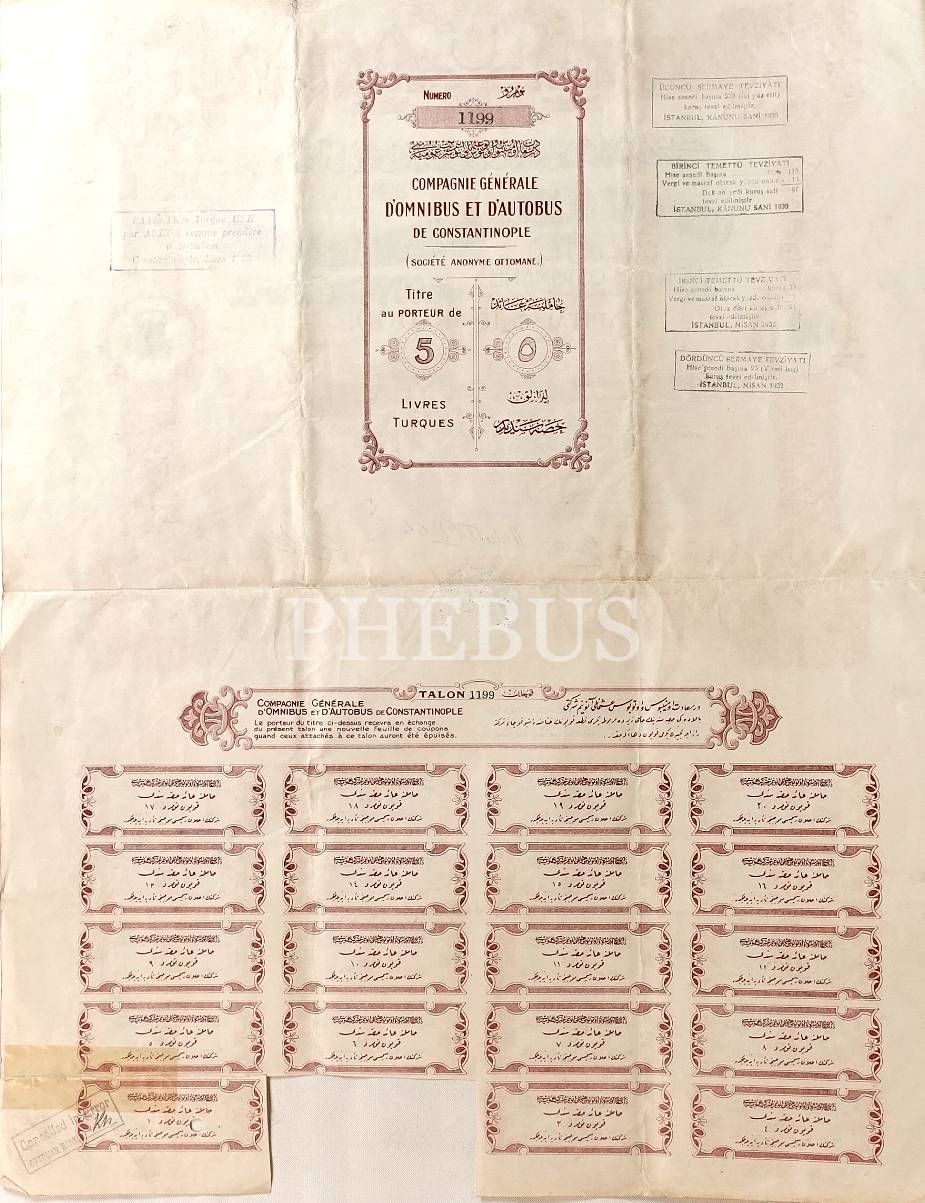 Dersaadet/Constantinople Omnibüs ve Otobüs Osmanlı Anonim Şirket-i Umumiyesi´nin Osmanlıca-Fransızca hisse senedi, 41x53 cm