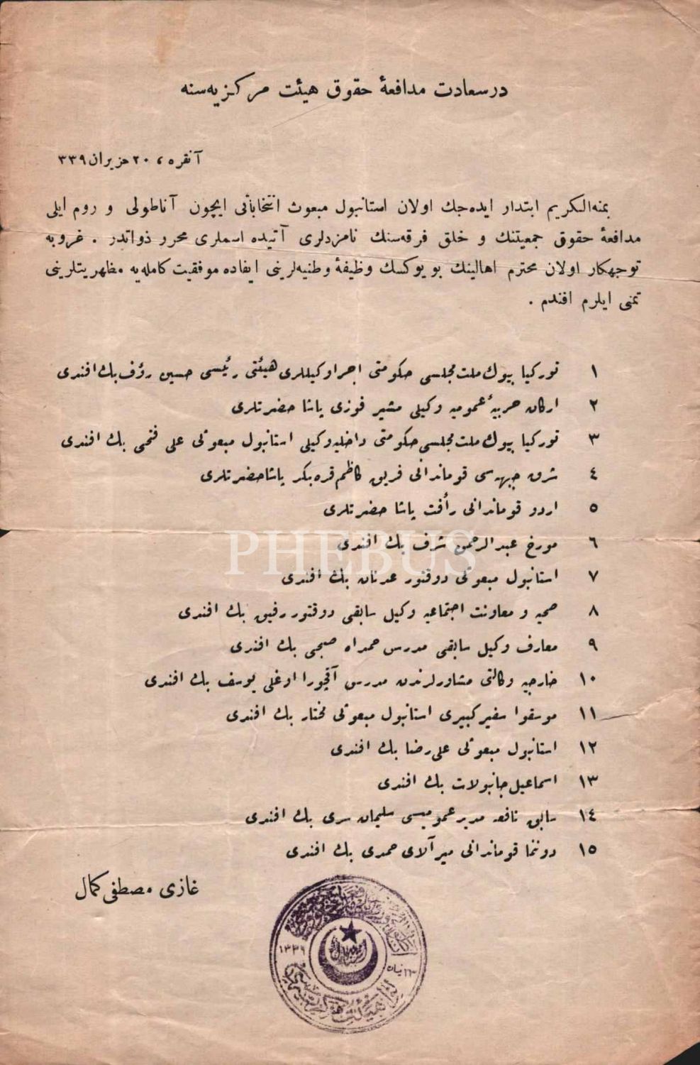 Gazi Mustafa Kemal Atatürk tarafından Dersaadet Müdafaa-i Hukuk Merkezî Heyetine gönderilen aday listesi, 1339, 15x23 cm
