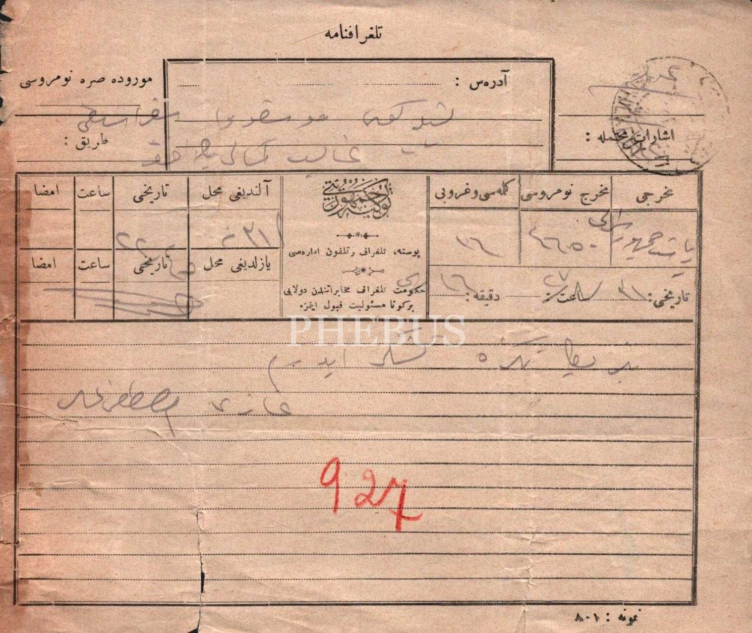 Galip Kemali Söylemezoğlu terekesinden, Gazi Mustafa Kemal Atatürk tarafından Diplomat Galip Kemali Söylemezoğlu´ya gönderilen teşekkür telgrafı, 1322, 16x19 cm