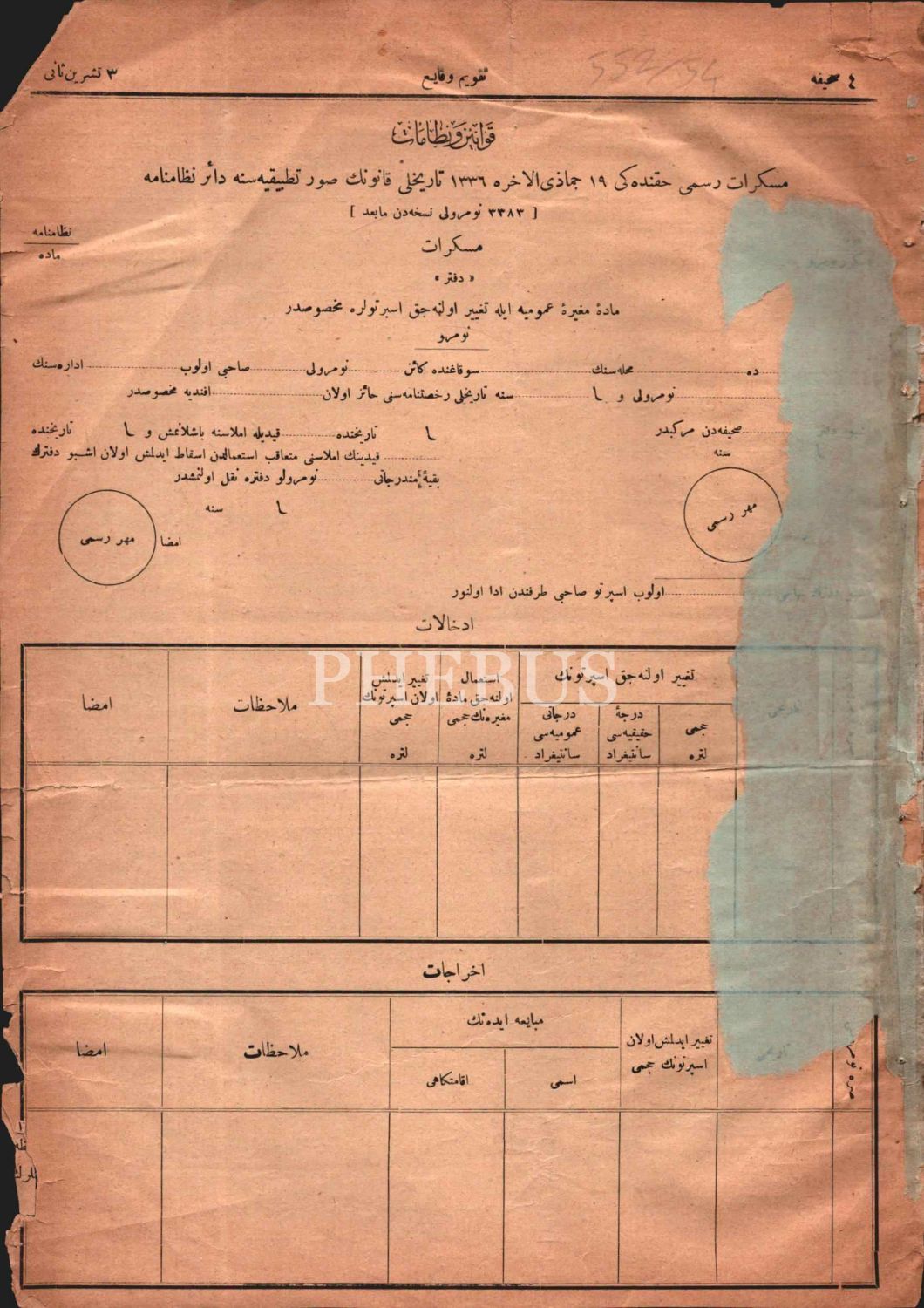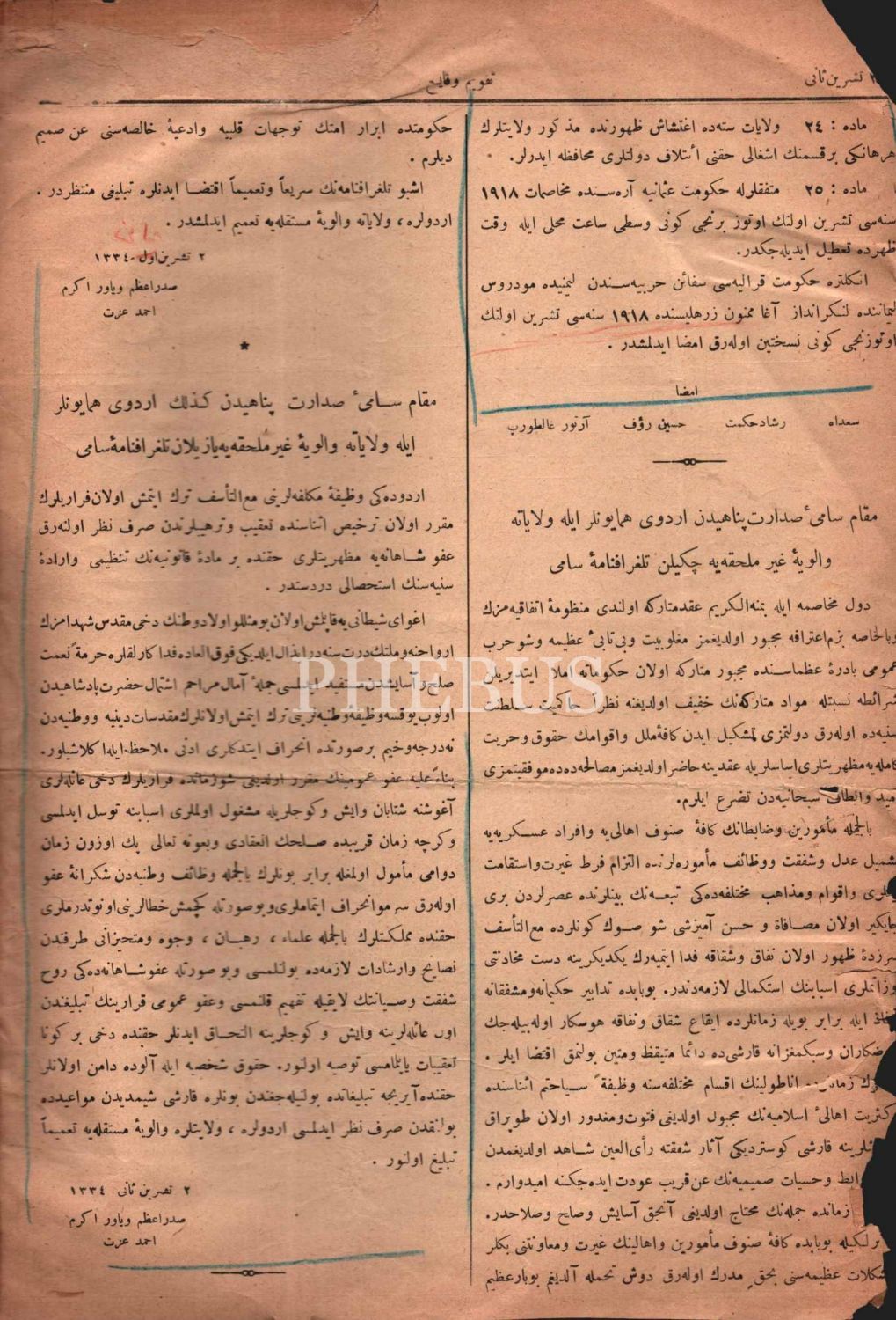 Devlet-i Aliyye-i Osmaniye´nin resmî gazetesi TAKVÎM-İ VEKÂYİ´in Mondros Mütarekesi maddelerini içeren yayını, 3 Teşrinisani 1334, 22x32 cm