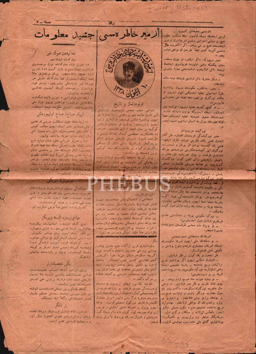İzmir´in geri alınışına dair "İzmir Hatırası" başlıklı ve Mustafa Kemal Atatürk görselli haberin yer aldığı BİRLİK gazetesi, 29x39 cm