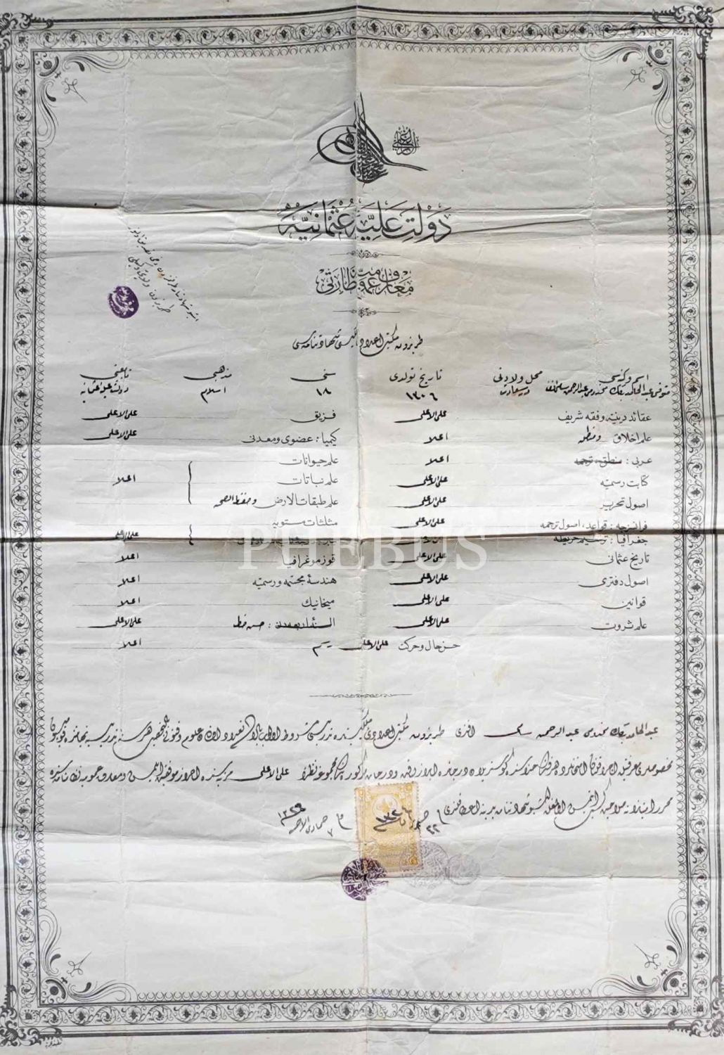 Abdurrahman Sami Efendi´ye ait Trabzon Mekteb-i İdadi-i Mülki şehadetnamesi, 1326, 40x56 cm