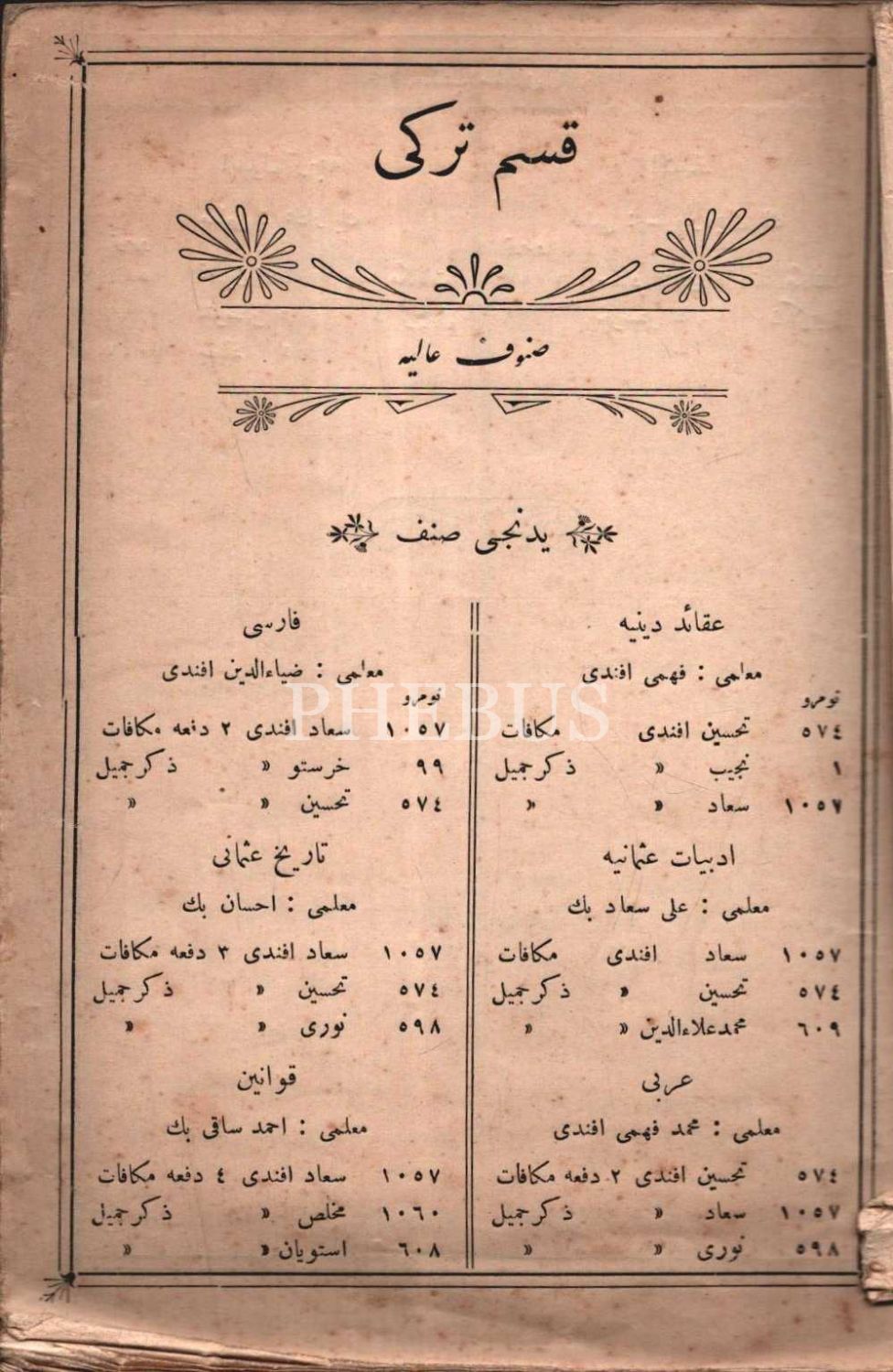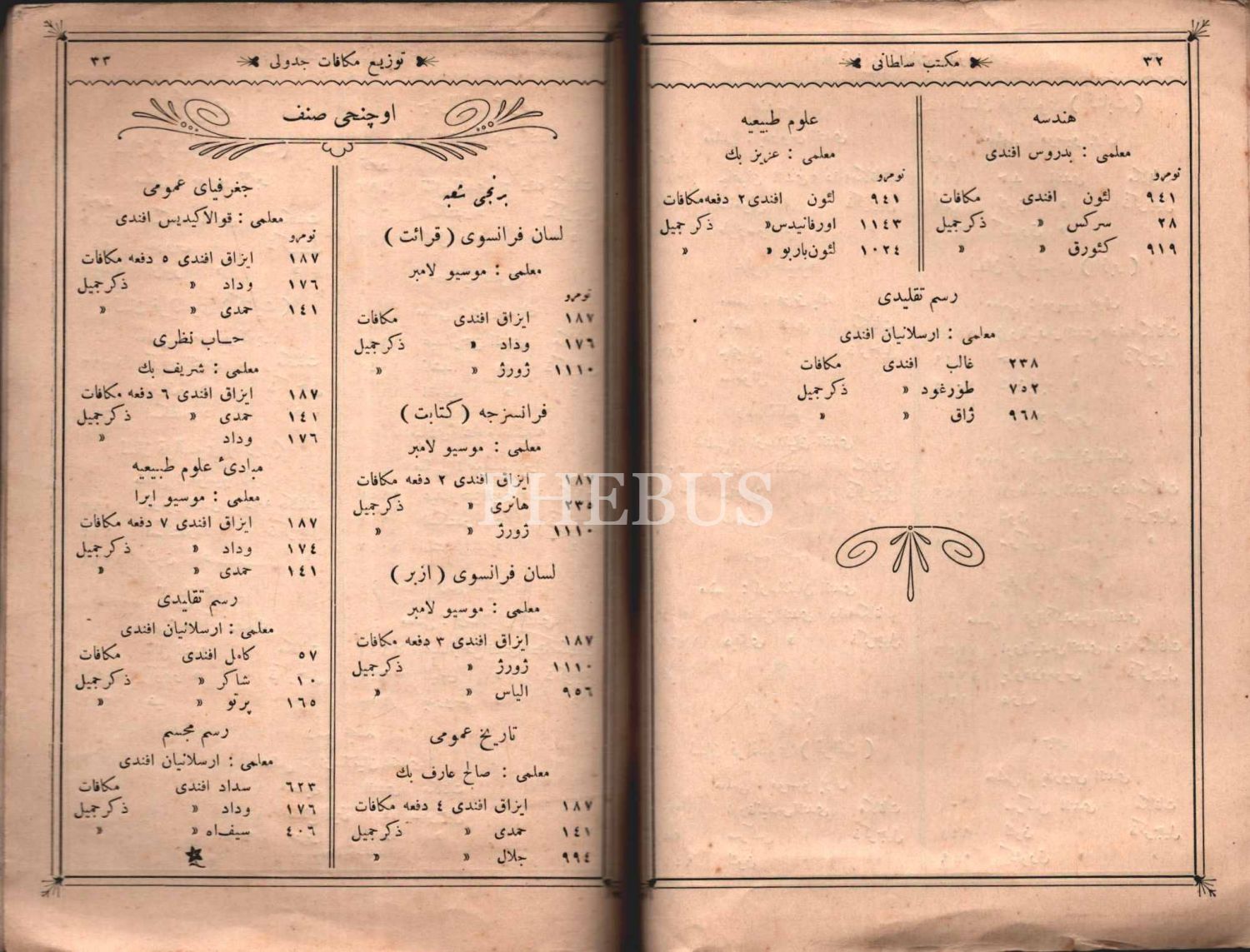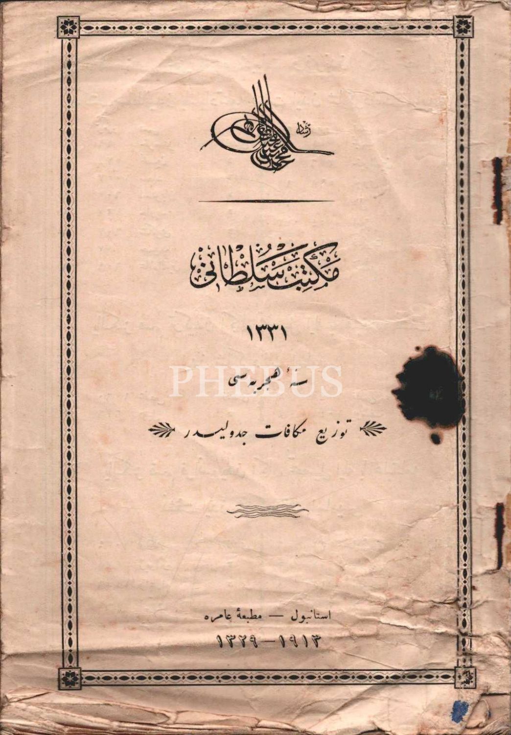 Mekteb-i Sultânî 1331 Hicri Senesi Tevzî-i Mükâfat [Ödül Dağıtım] Cedveli, Matbaa-i Amire, İstanbul 1913, 51 s., 14x20 cm