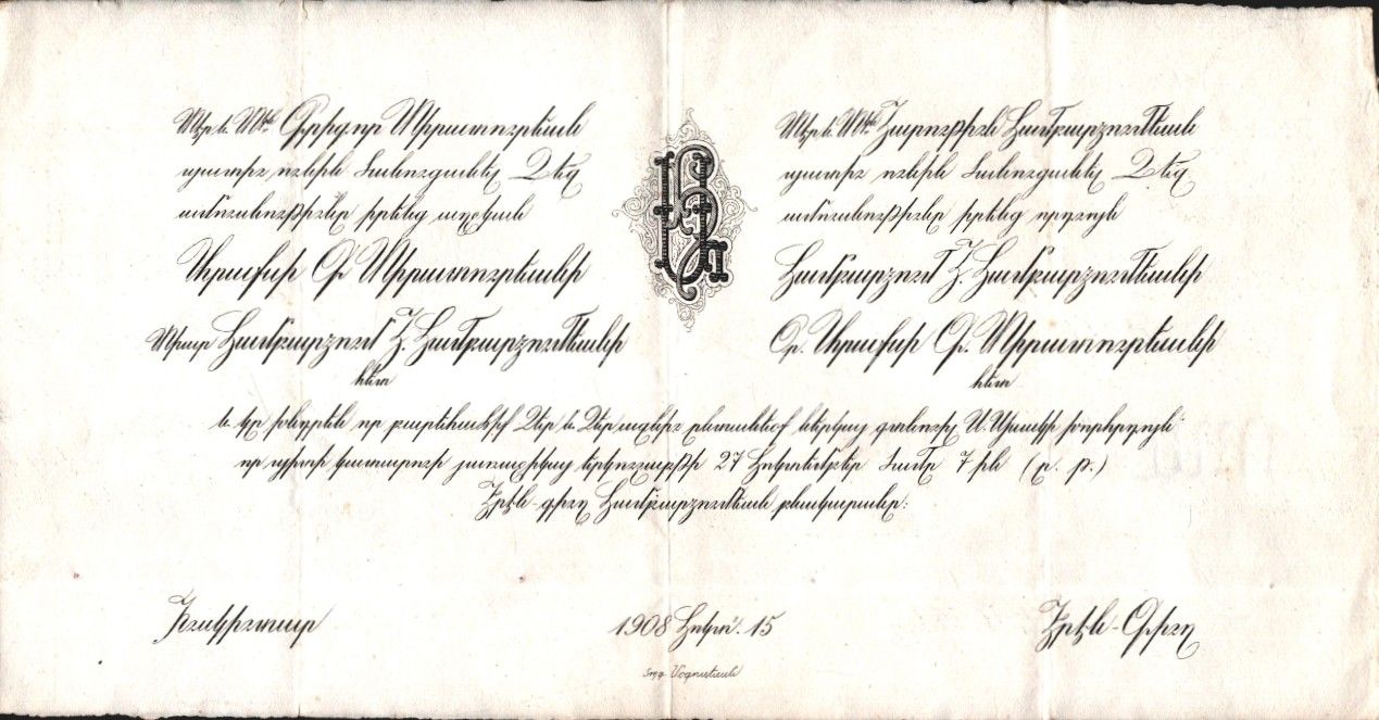 Araksi Diradorosyan ile Hampartsum Hampartsumyan´ın Ermenice nikâh davetiyesi, Erenköy/İstanbul 1908, 16x32 cm