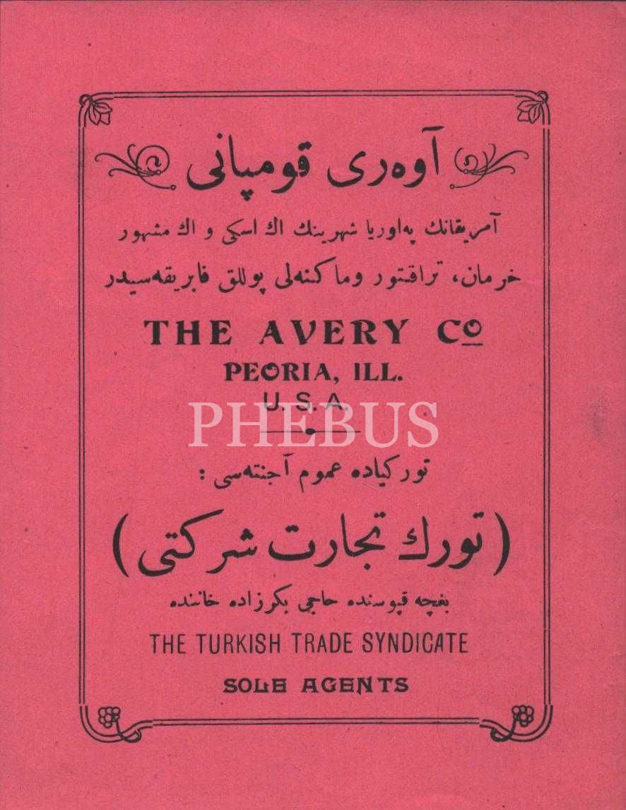 "Amerika´nın Peoria şehrinin en eski ve en meşhur harman, traktör ve makineli pulluk fabrikası" THE AVERY COMPANY´nin Osmanlıca-İngilizce el ilanı, 11x15 cm