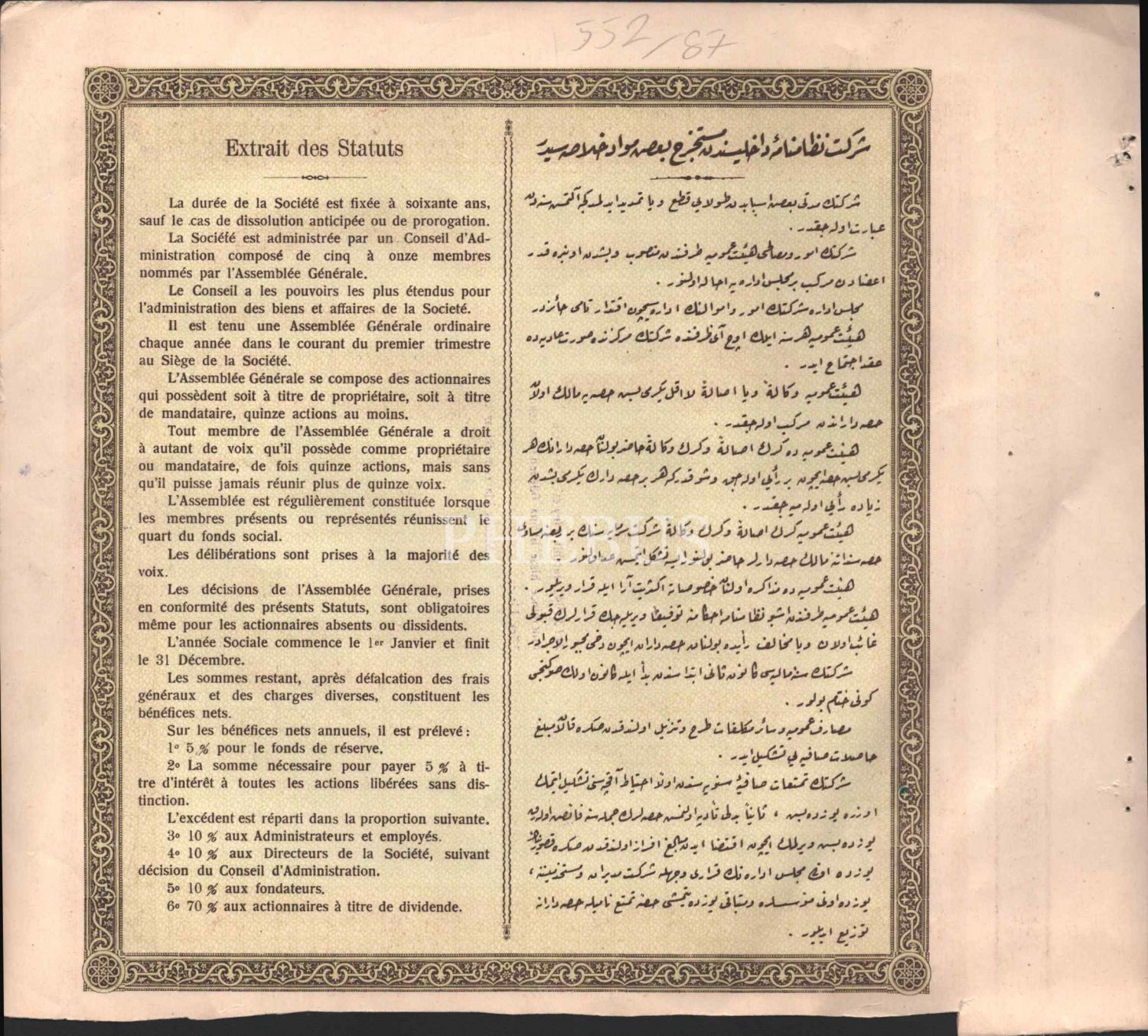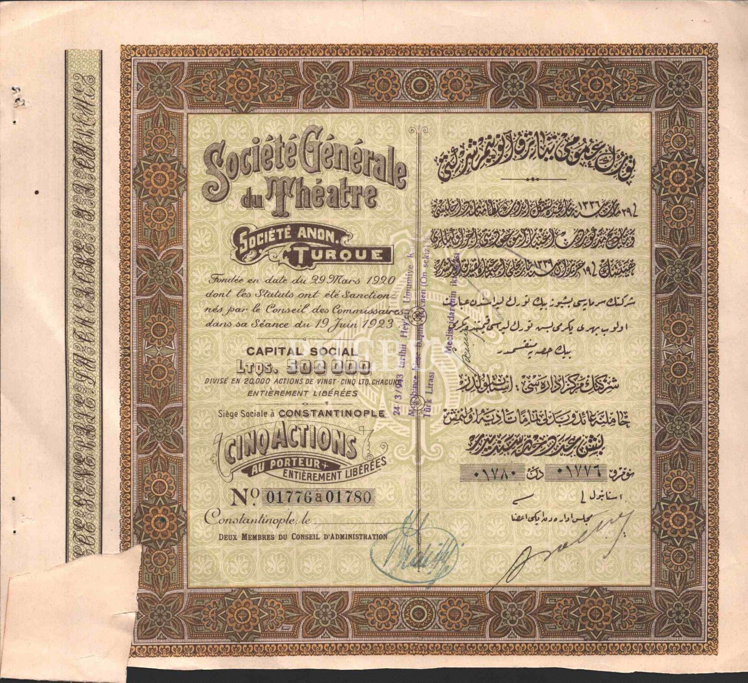 Türk Umumi Tiyatro Anonim Şirketi´nin Osmanlıca-Fransızca hisse senedi, 26x30 cm