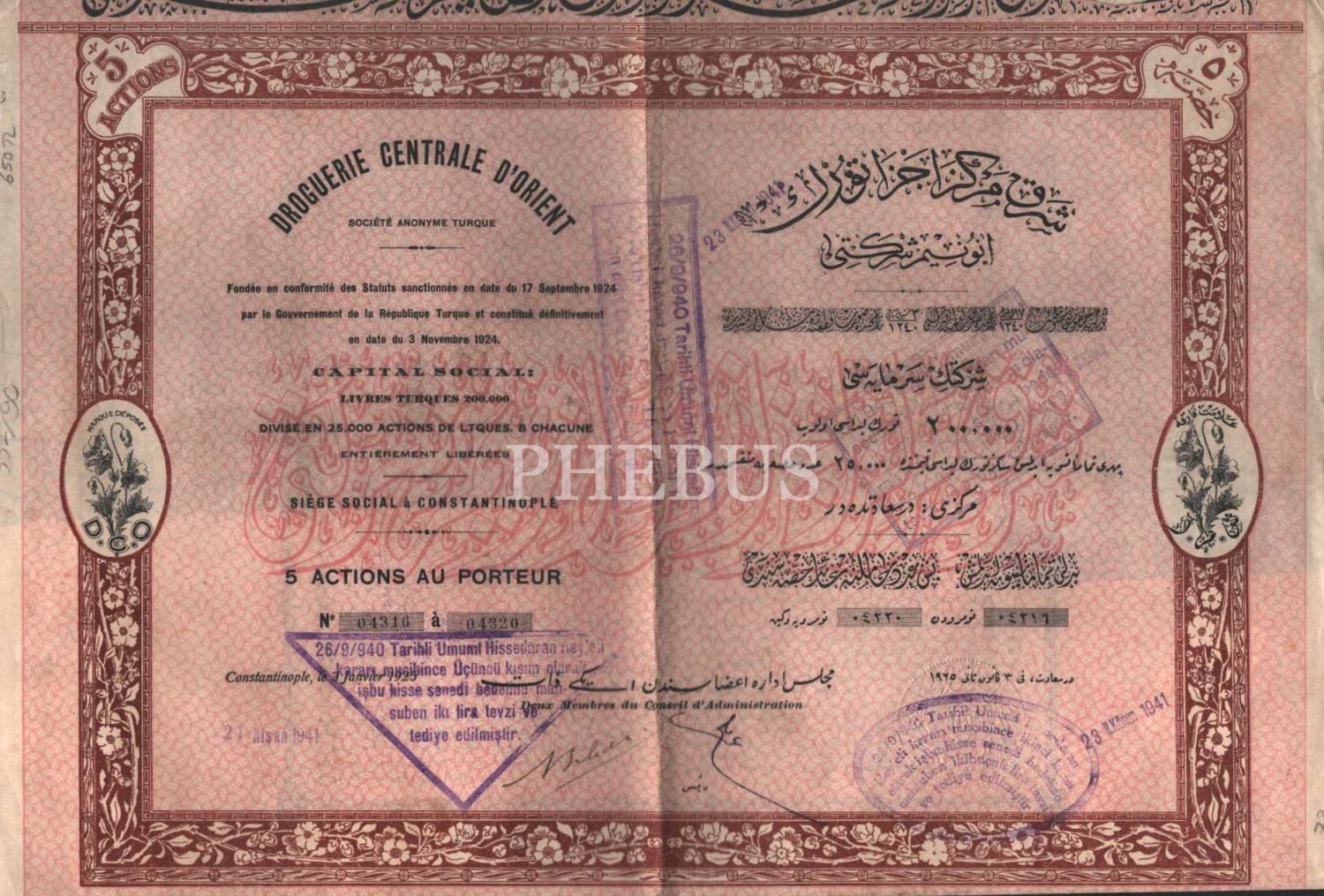 Şark Merkez-i Ecza Şirketi Anonim Şirketi´ne ait Osmanlıca-Fransızca hisse senedi, 42x43 cm