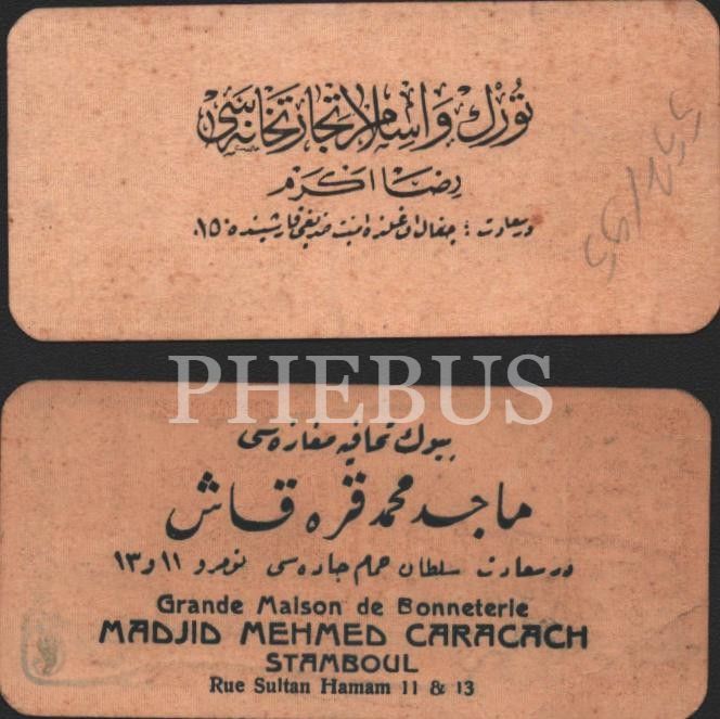 Kartlardan birinin arka yüzünde, Osmanlıca-Fransızca "Büyük Tuhafiye Mağazası Macid Mehmed Karakaş, Dersaadet", diğerinin arkasında ise Osmanlıca "Türk ve İslam Ticarethanesi Rıza Ekrem, Dersaadet" yazmaktadır.