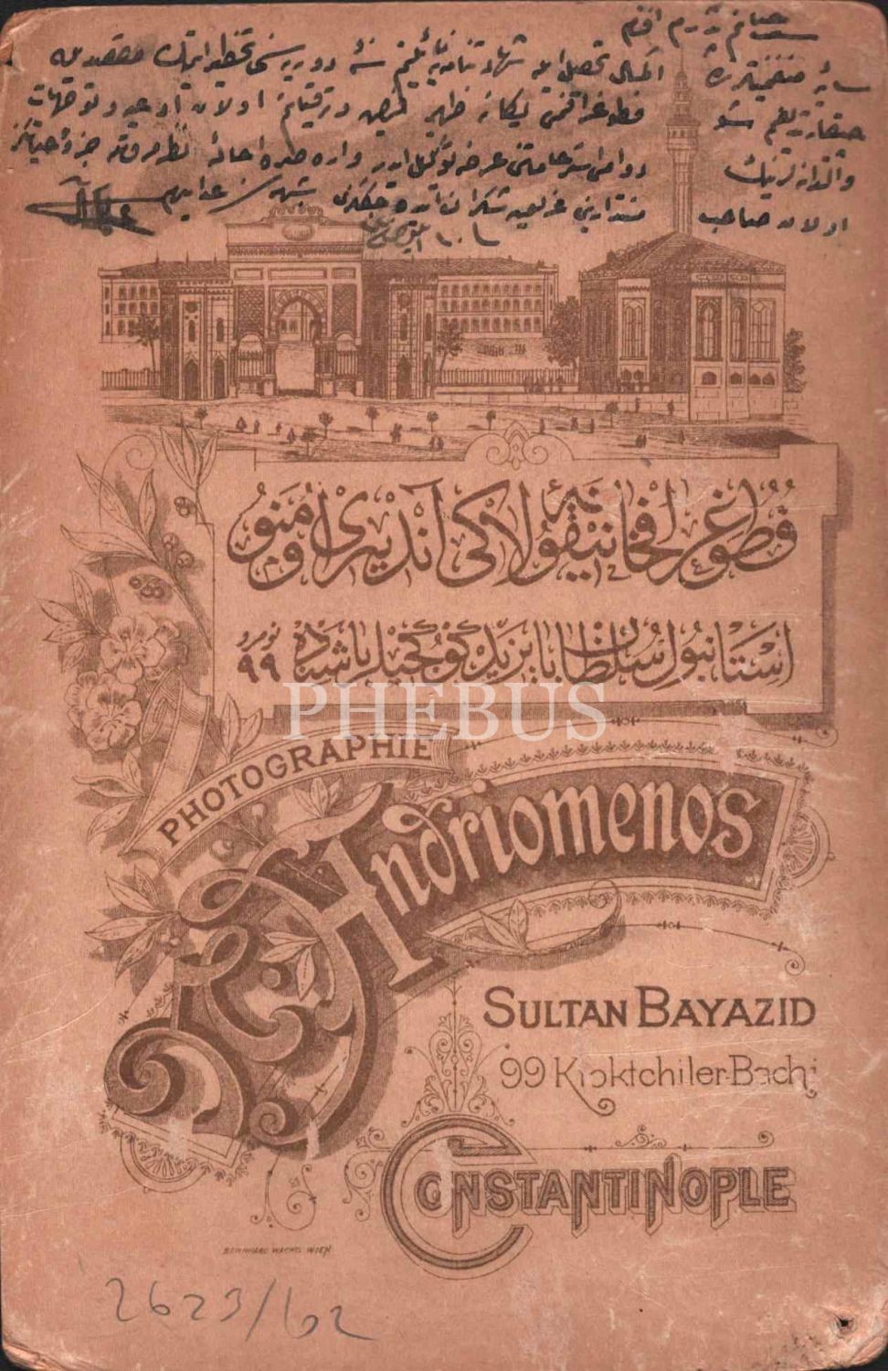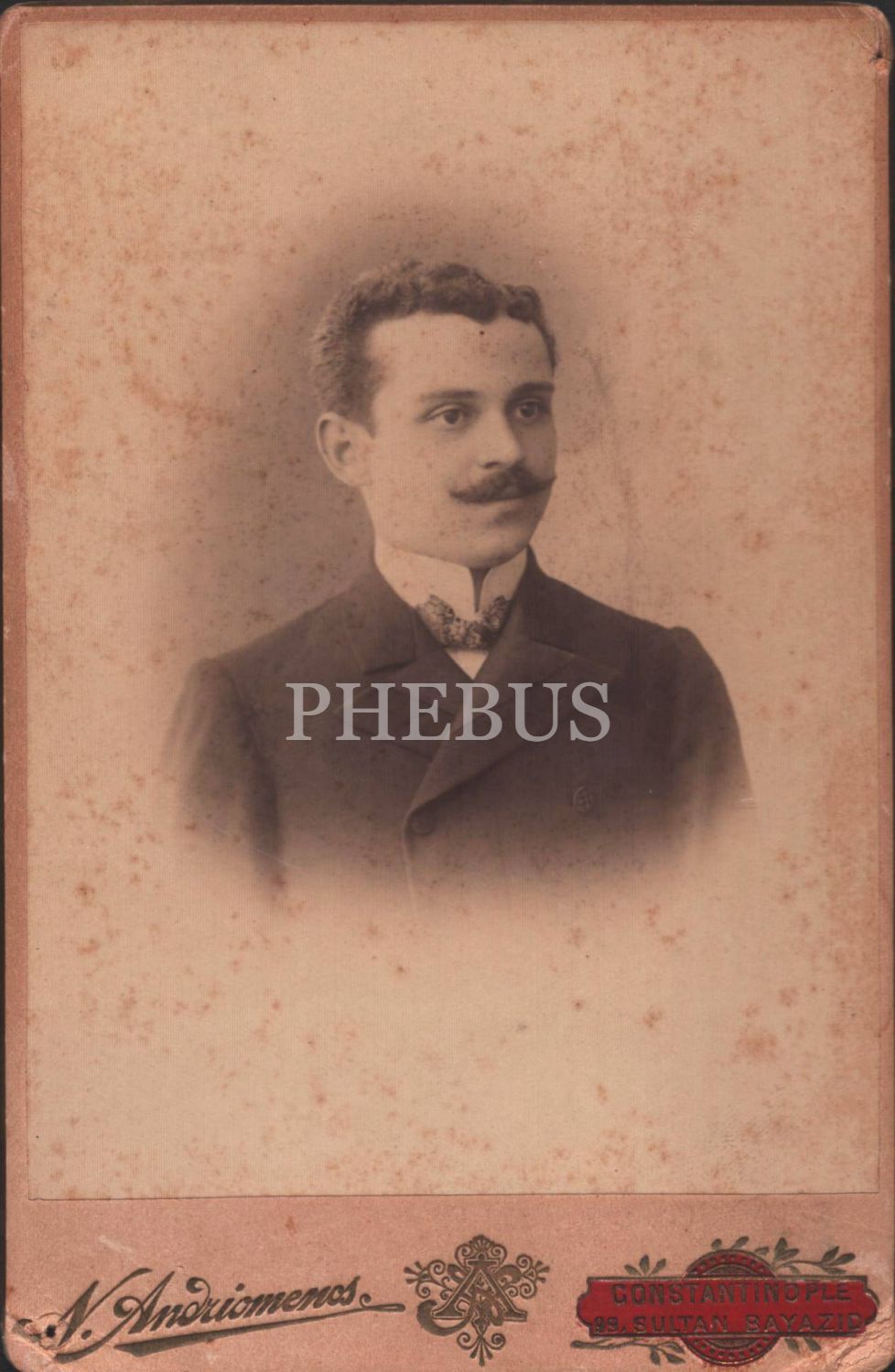 Papyonlu şık giyimli beyefendinin ithaflı hatıra kabin fotoğrafı, 1320, N. Andriomenos Fotoğrafhanesi- Constantinople, 11x16 cm