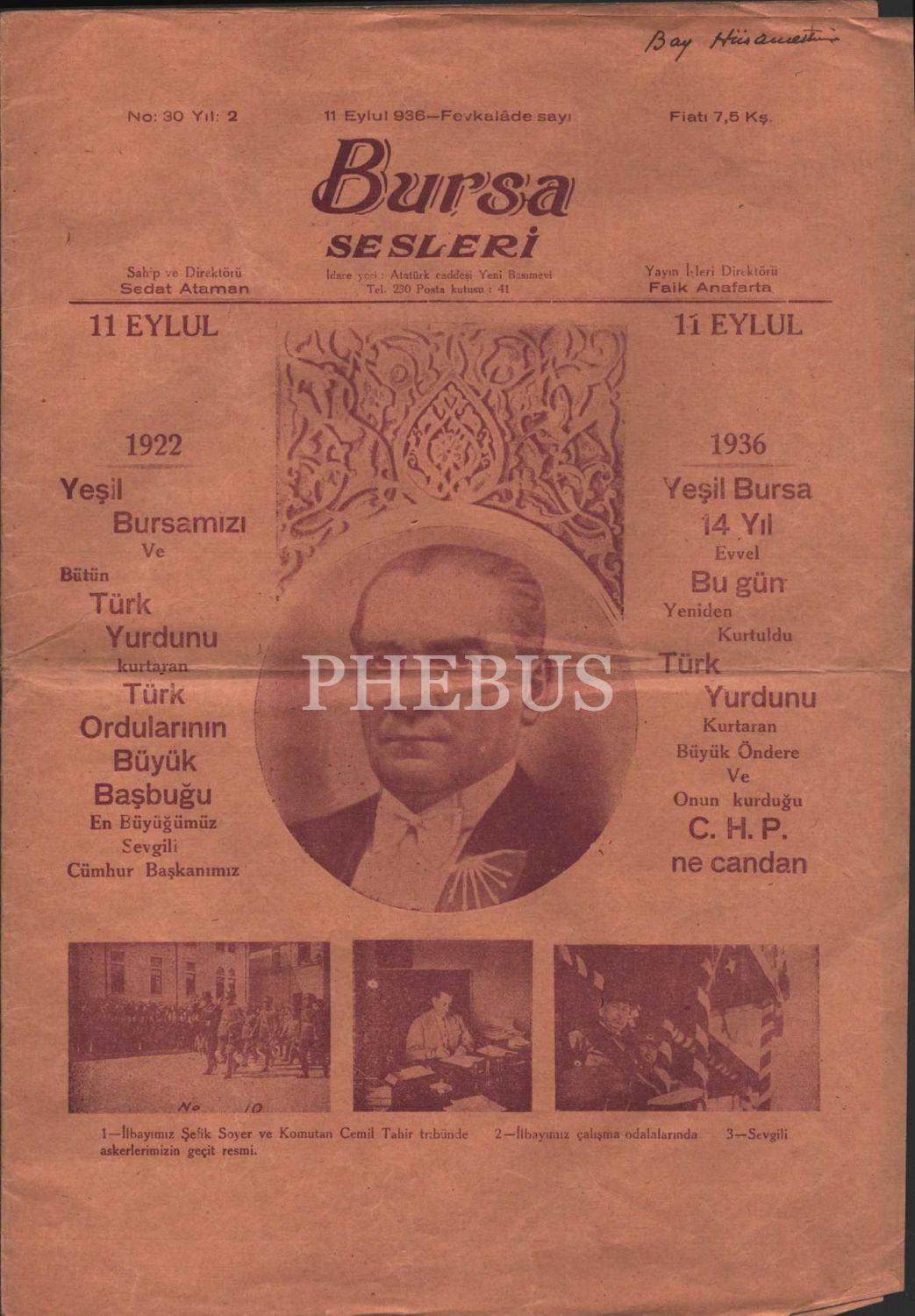 BURSA SESLERİ´nin Mustafa Kemal Atatürk görselli fevkalâde [özel] sayısı, 11 Eylül 1936, 28x41 cm
