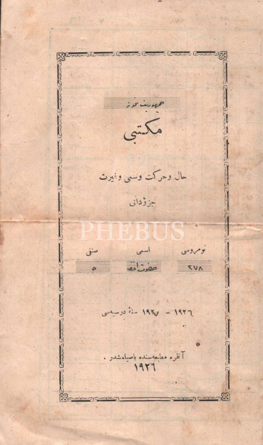 Cumhuriyet Numune Mektebi hal ve hareket ve sa´y ve gayret cüzdanı [karne], Ankara 1927, 24x28 cm