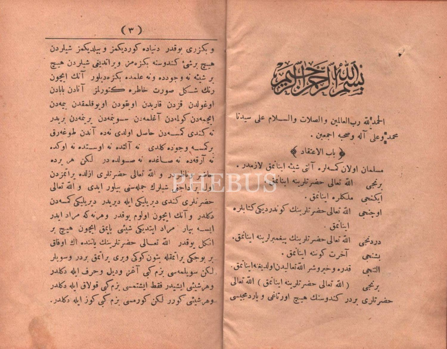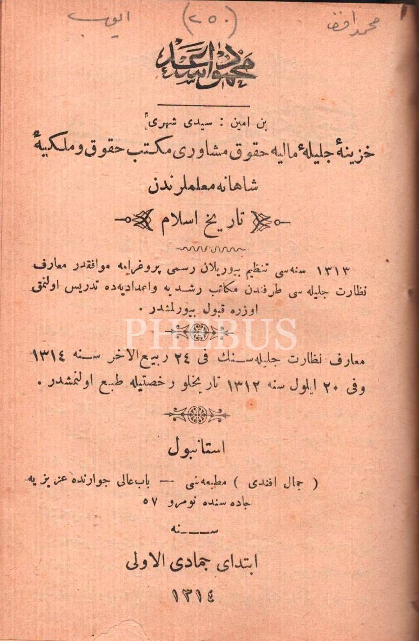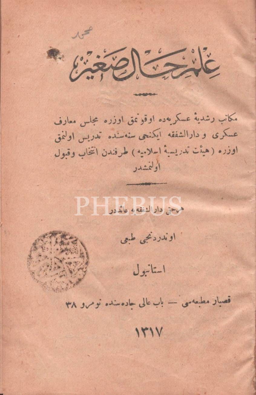 Osmanlı armalı cildinde 2 eser bir arada: İLM-İ HÂL-İ SAGÎR, Kasbar Matbaası, İstanbul 1317, 54 s.; TÂRÎH-İ İSLÂM, Seydişehrî Mahmud Esad, Cemal Efendi Matbaası, İstanbul 1314, 190 s., 12x17 cm