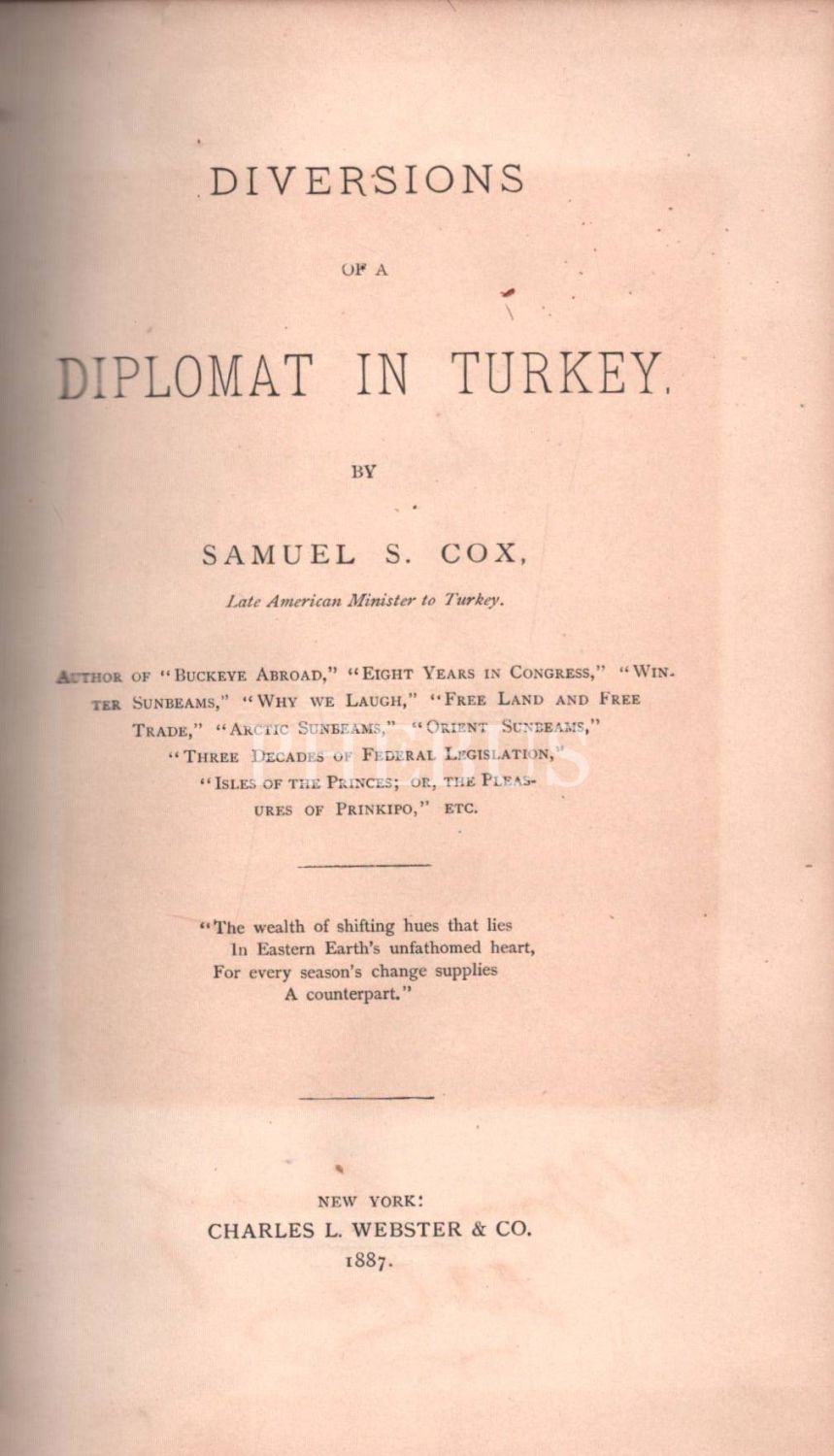Ay yıldızlı cildinde DIVERSIONS OF A DIPLOMAT IN TURKEY, Samuel S. Cox, yayınlayan: Charles L. Webster & Co., New York 1887, 685 s., 16x24 cm