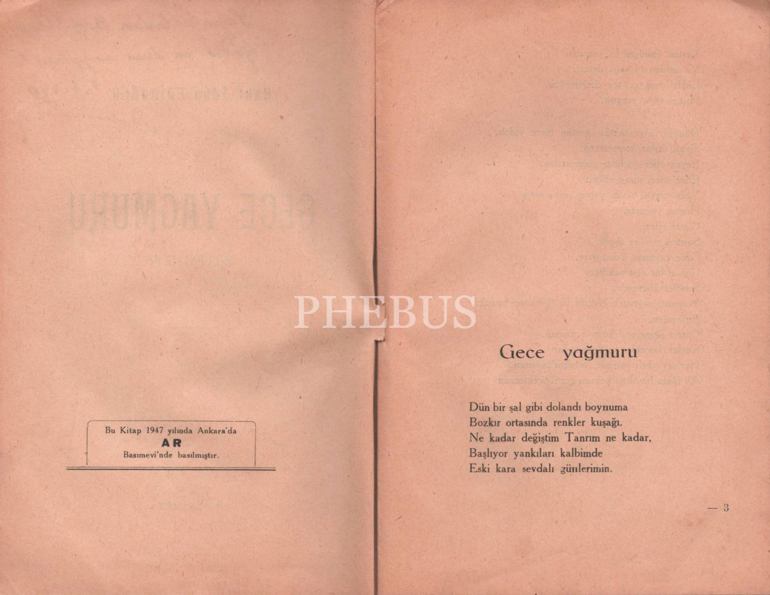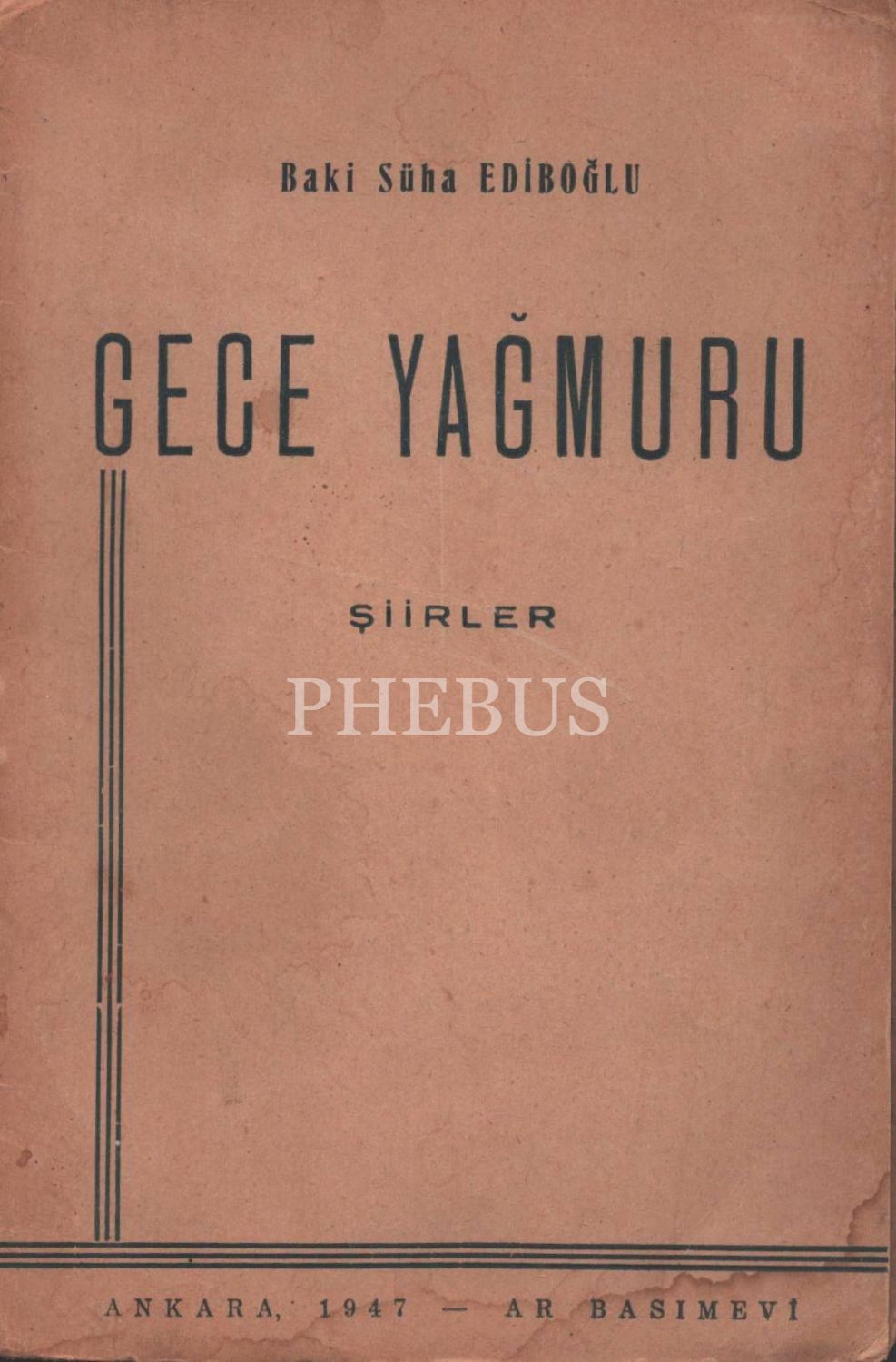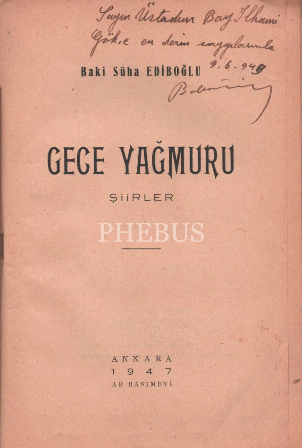Şair Baki Süha Ediboğlu´dan ithaflı ve imzalı GECE YAĞMURU (Şiirler), Ar Basımevi, Ankara 1947, 31 s., 14x21 cm