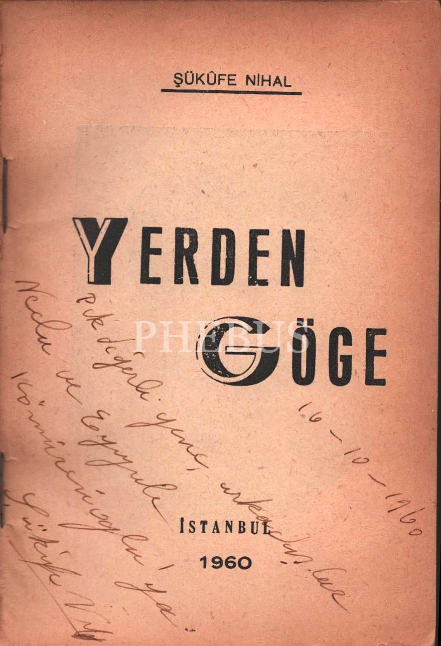 "Türkiye´de Darülfünun mezunu ilk kadın" unvanının sahibi şair, öğretmen ve aktivist Şükûfe Nihal´den ithaflı ve imzalı YERDEN GÖĞE, La Turquie Moderne Matbaası, İstanbul 1960, 159 s., 12x16 cm