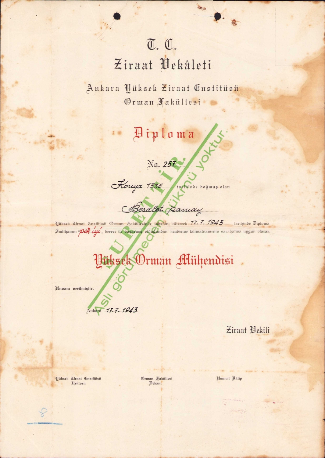 TC. Ziraat Vekaleti Ankara Yüksek Ziraat Enstitüsü Orman Fakültesi, haliyle, 26x36 cm.