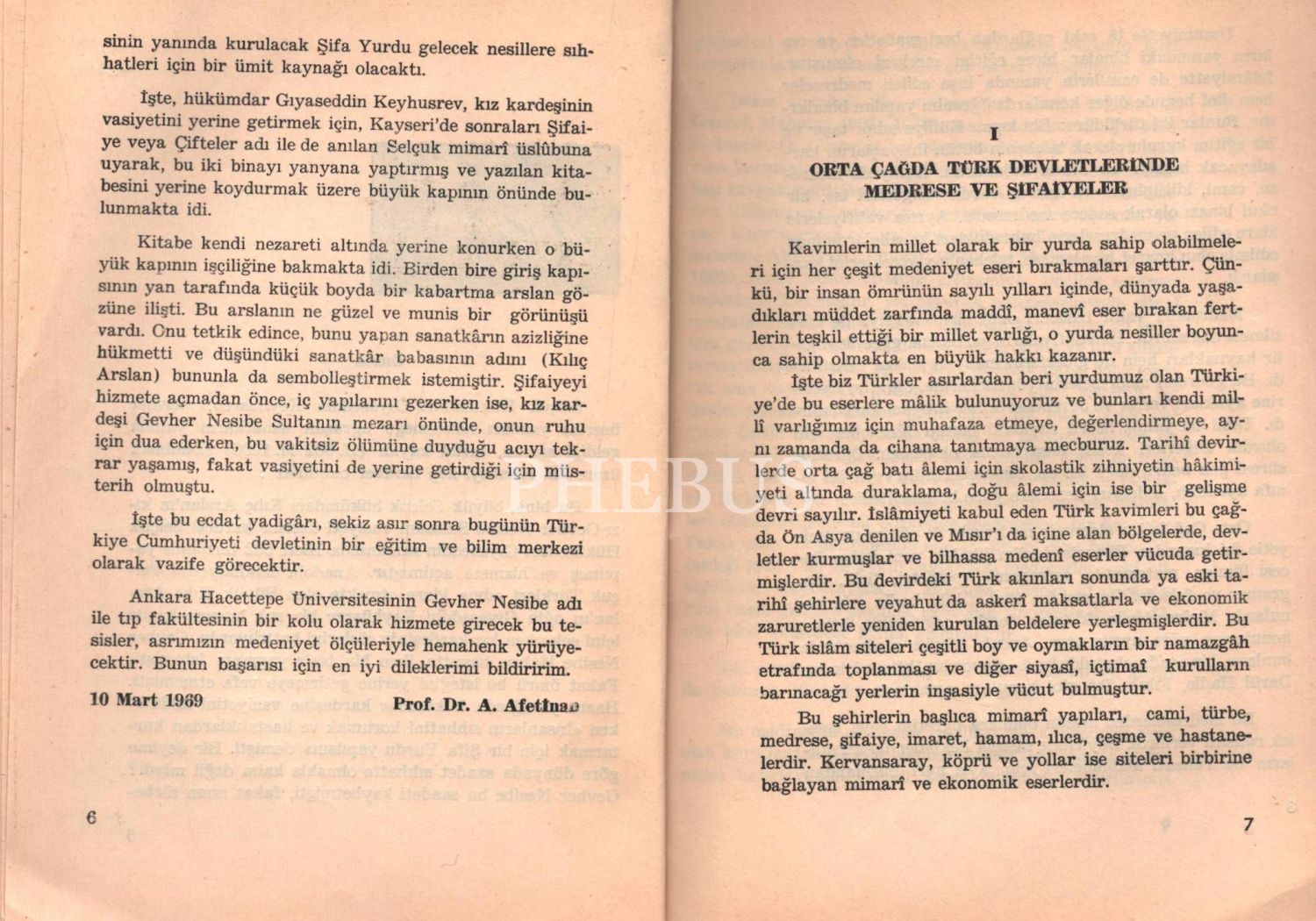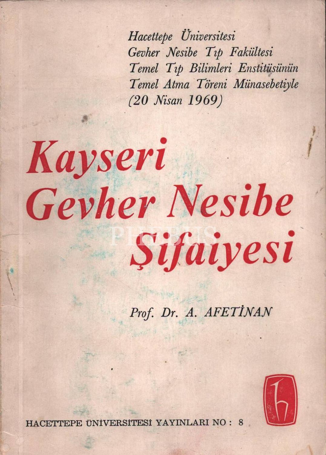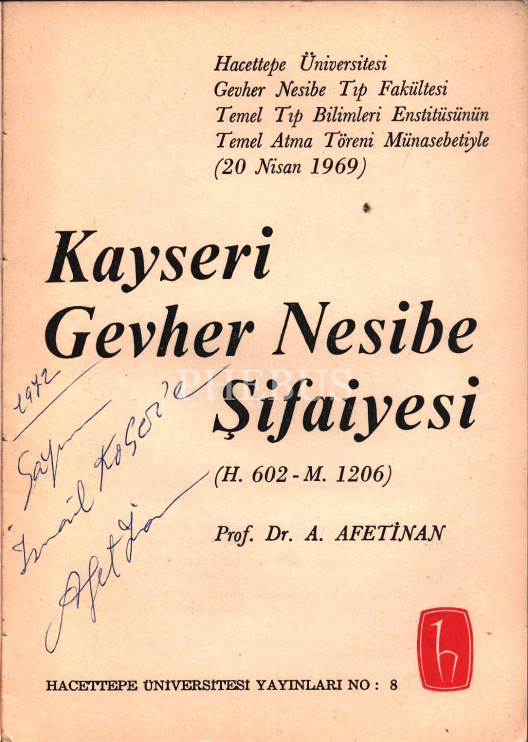 Yazarı Afet İnan´dan ithaflı ve imzalı KAYSERİ GEVHER NESİBE ŞİFAİYESİ (H. 602 - M. 1206), Hacettepe Üniversitesi Yayınları, 40 s., 14x20 cm