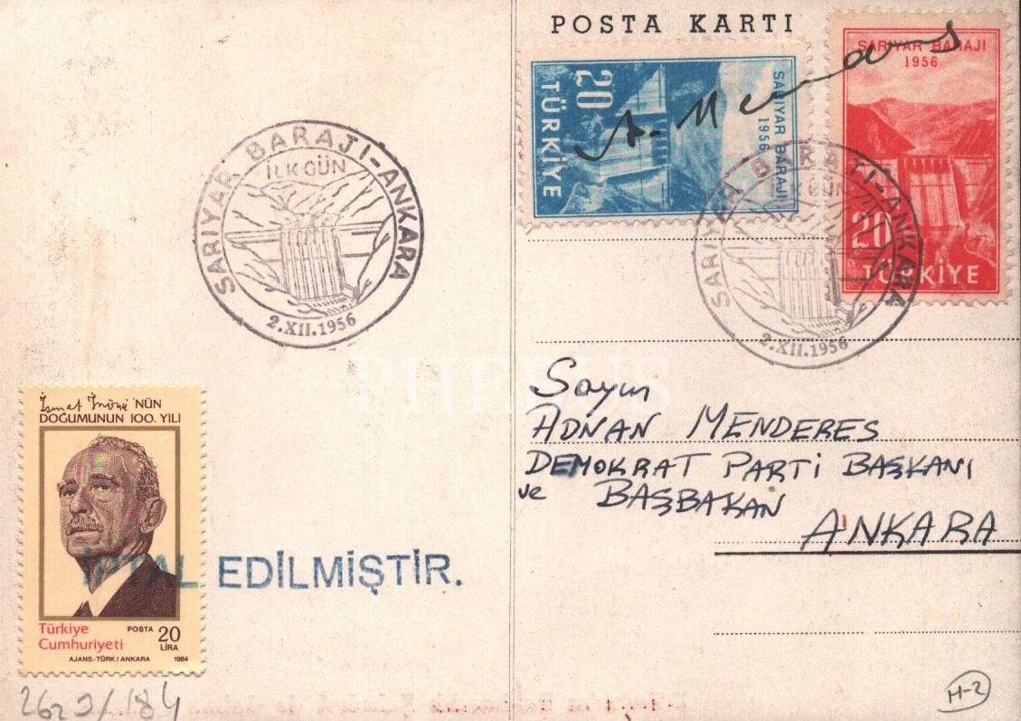 DP Başkanı ve Başbakan Adnan Menderes´e gönderilen "Sarıyar Barajı - Ankara, İlk Gün" damgalı kart