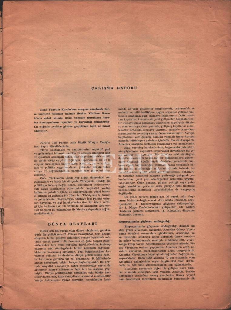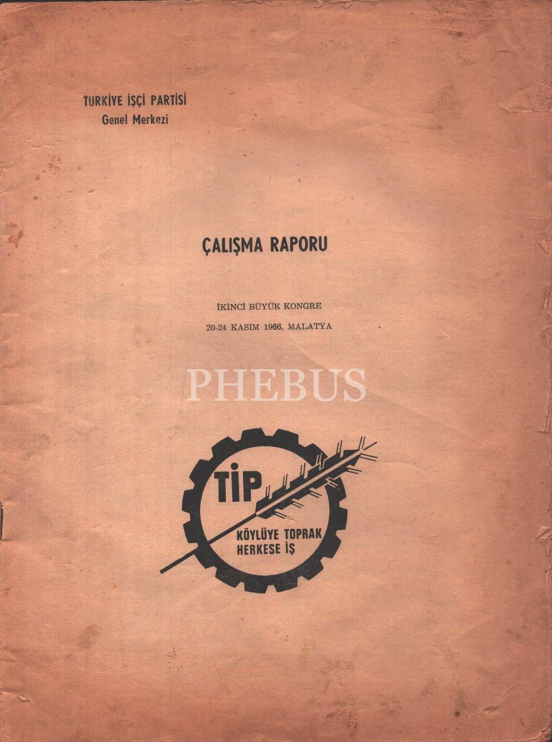 Türkiye İşçi Partisi Genel Merkezi yayınlarından ÇALIŞMA RAPORU (İkinci Büyük Kongre, 20-24 Kasım 1966, Malatya), İstanbul 1966, 43 s., 24x33 cm