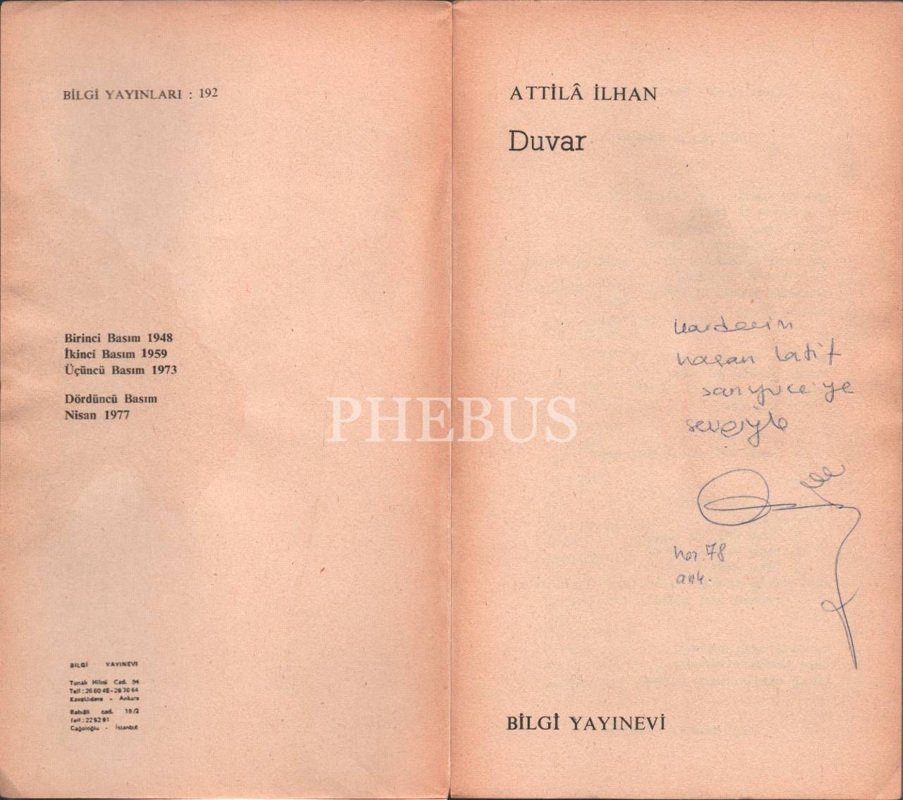 Attilâ İlhan´dan ithaflı ve imzalı DUVAR, Bilgi Yayınevi, İstanbul 1977, 212 s., 11x19 cm