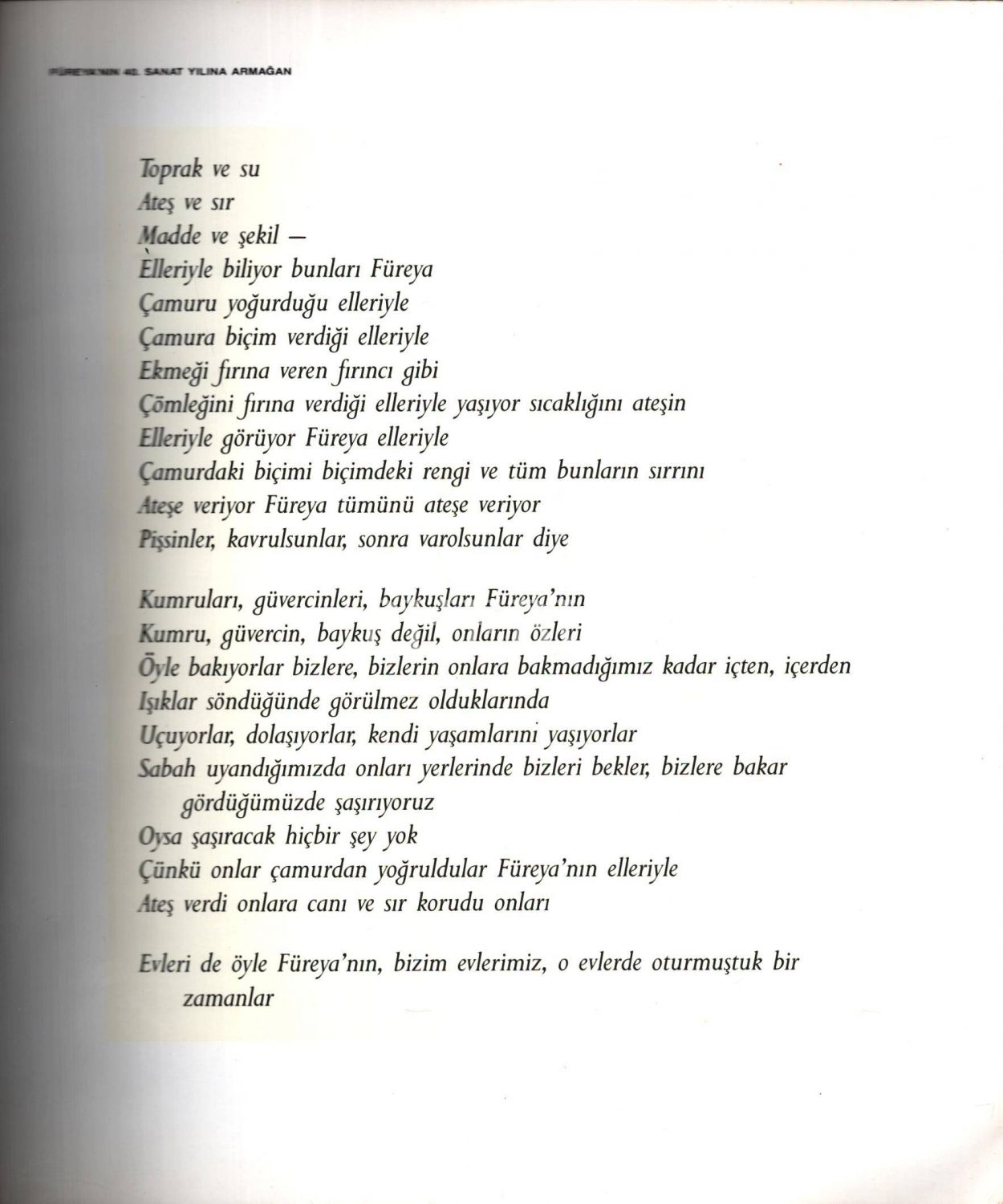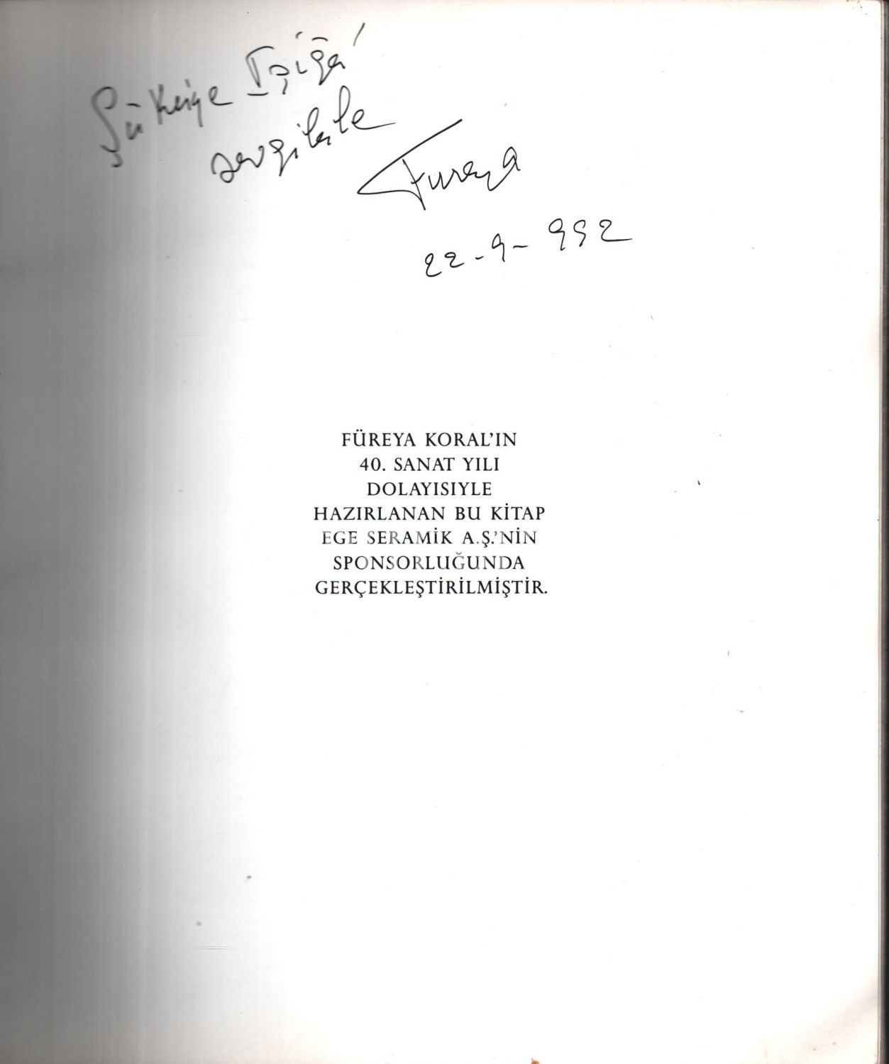 Füreya Koral´ın 40. Sanat yılı dolayısıyla hazırlanmıştır. İthaf; "Şükriye Işığa sevgilerle, 1992"