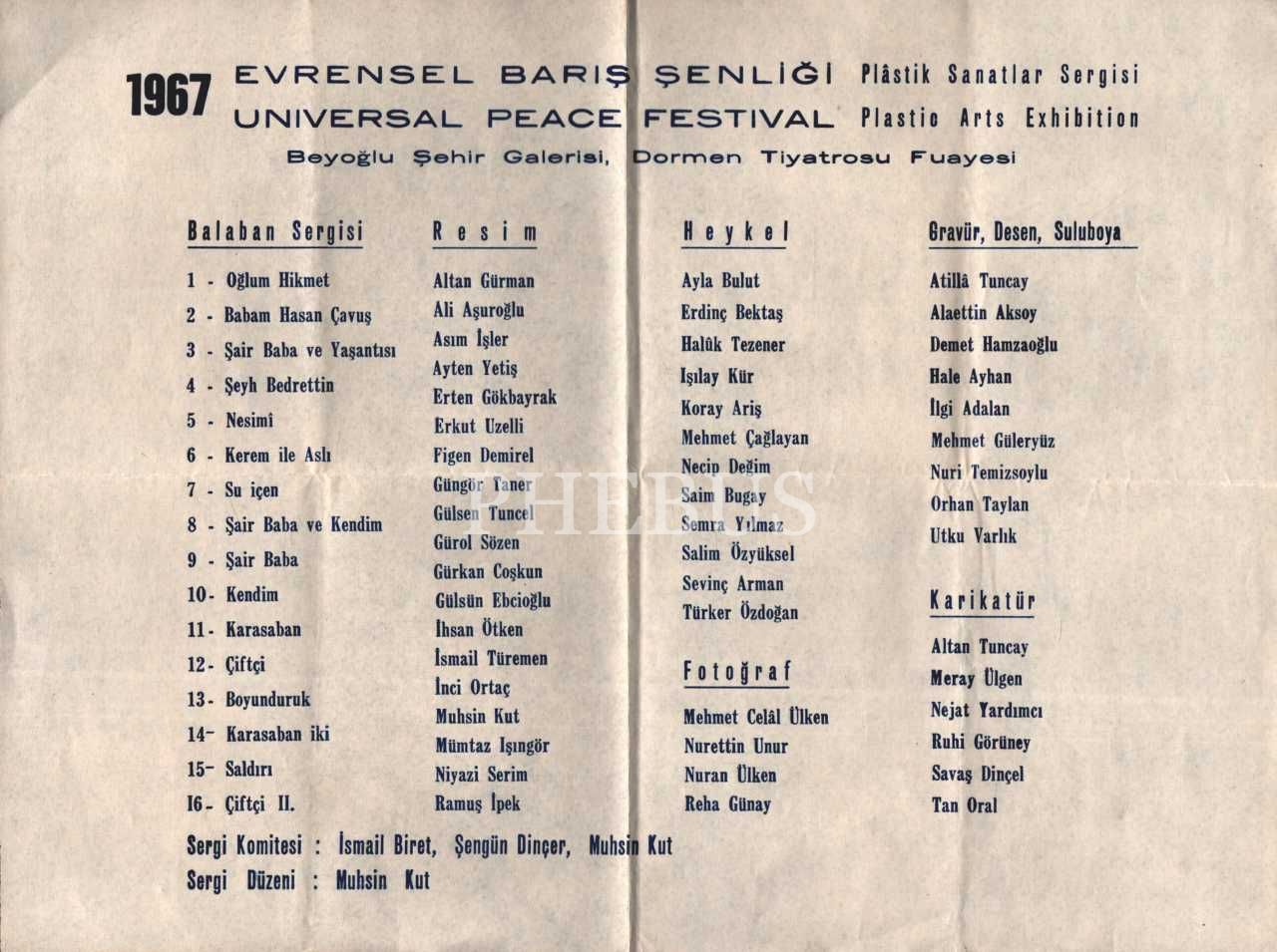 Evrensel Barış Şenliği Plastik Sanatlar Sergisi, Beyoğlu Şehir Galerisi Dormen Tiyatrosu Fuayesi afişi, 1967, 25x32 cm