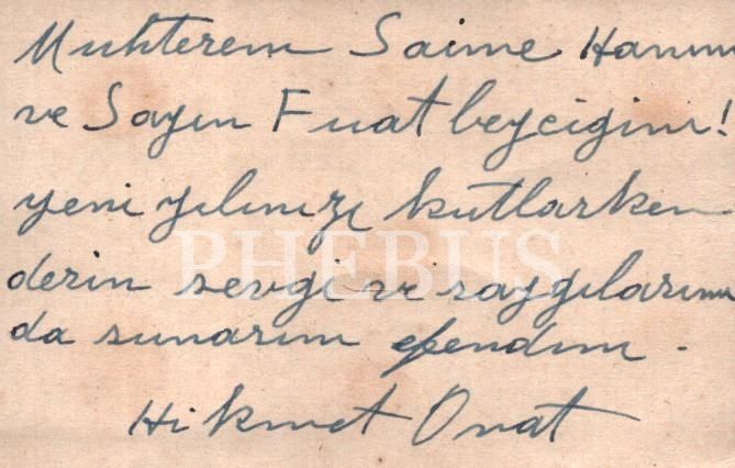 Empresyonist akımın Türkiye´deki en büyük temsilcilerinden biri olan usta ressam Hikmet Onat´ın Saime ve Fuat (Bayramoğlu) çiftine gönderdiği samimi bir yeni yıl tebrik kartı, 8x6 cm