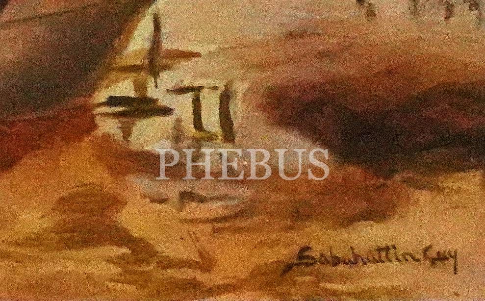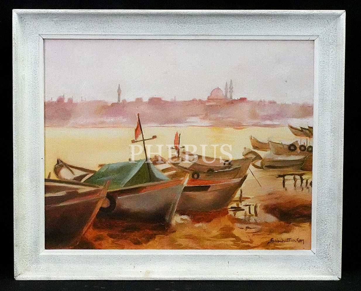 Sabahattin Çay tarafından imzalı tuval üzerine guaj boya manzara çizimi, çerçevesiyle birlikte 34x41 cm