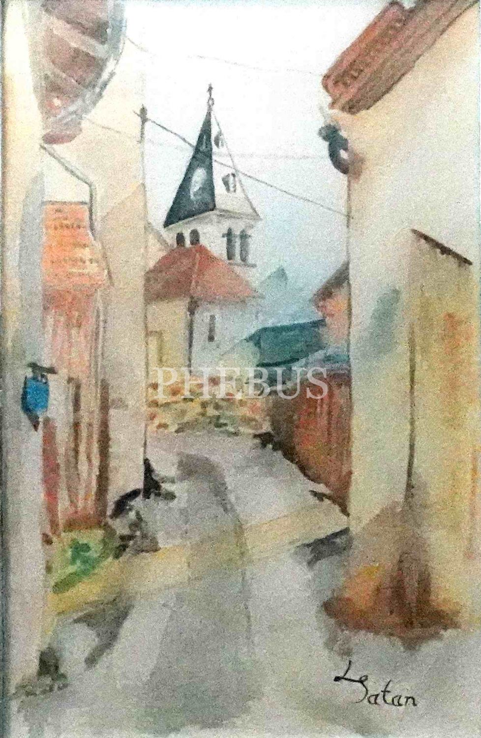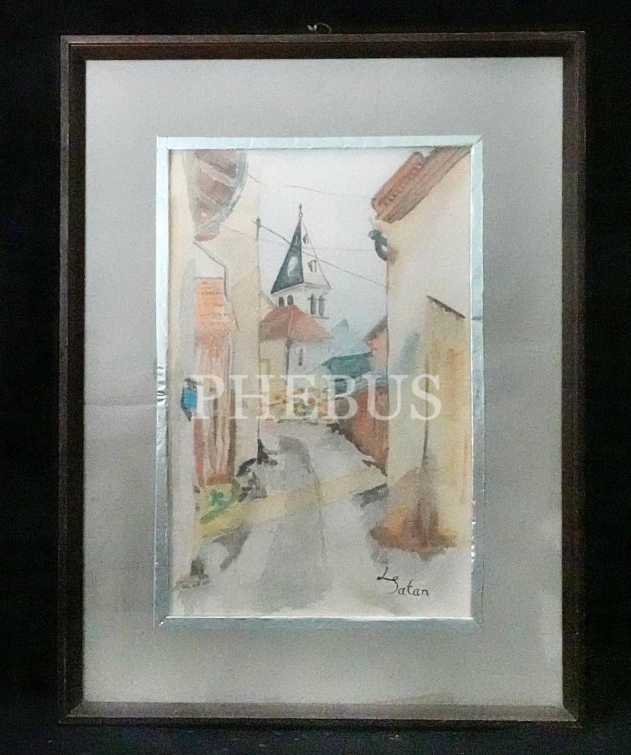"L. Satan" tarafından imzalı suluboya kilise çizimi, çerçevesiyle birlikte 40x52 cm