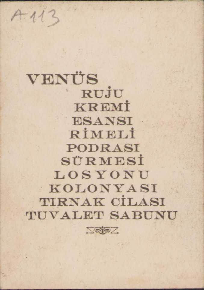 Venüs İtriyat Fabrikası reklam kartı, 8x6 cm ebat, Evliyazade Nureddin, İstanbul