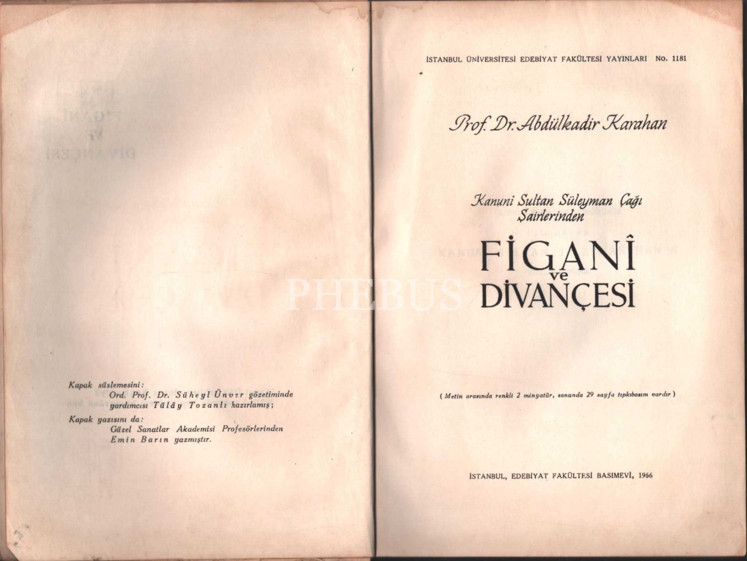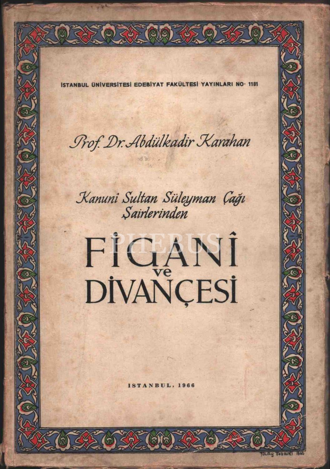 Kanuni Sultan Süleyman Çağı Şairlerinden FİGANÎ VE DİVANÇESİ, Prof. Dr. Abdülkadir Karahan, Edebiyat Fakültesi Basımevi, 1966, 214 sayfa + tıpkıbasımlar, 17x25 cm