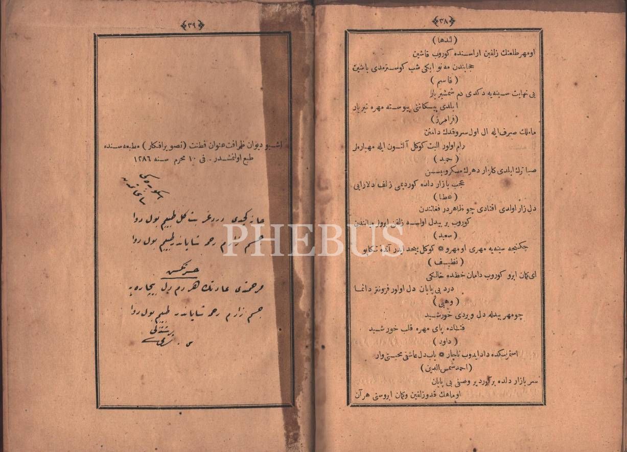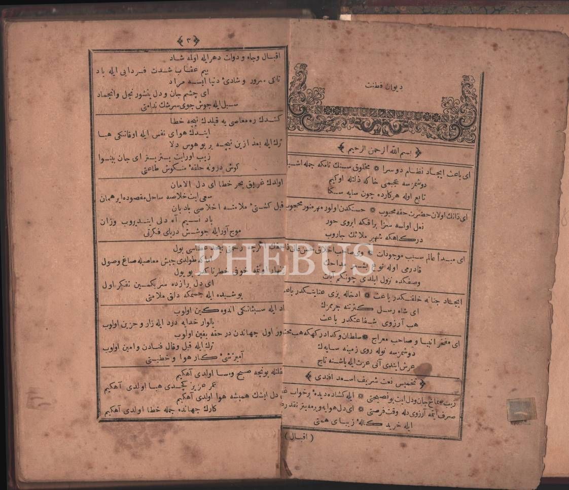 Deri sırtlı cildinde DÎVÂN-I FİTNAT, Tasvir-i Efkâr Matbaası, 1286, 52+39 sayfa, 16x24 cm
