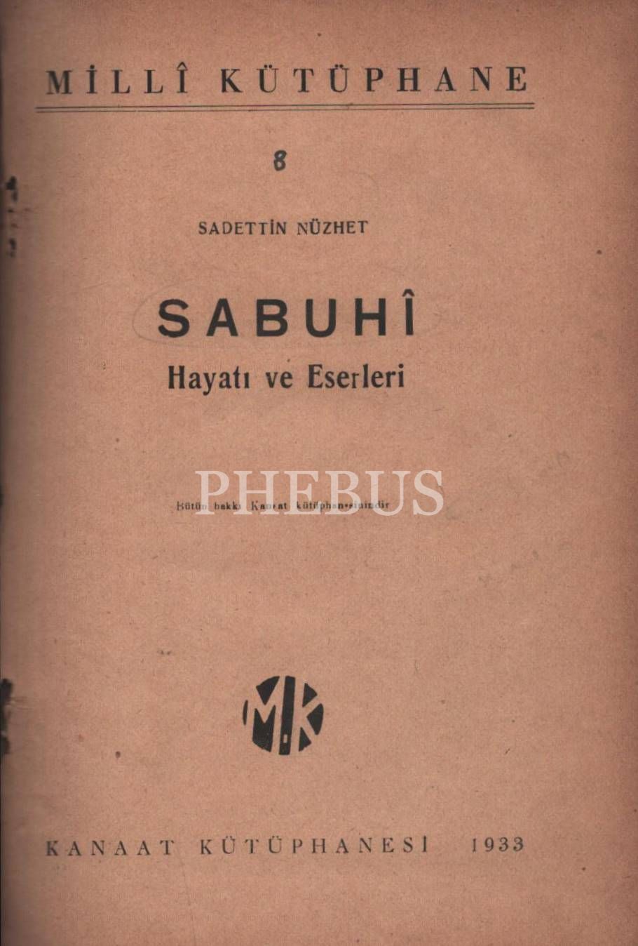 SABUHÎ Hayatı ve Eserleri, Sadeddin Nüzhet, Kanaat Kütüphanesi, İstanbul - 1933, 94 sayfa, 13x19 cm
