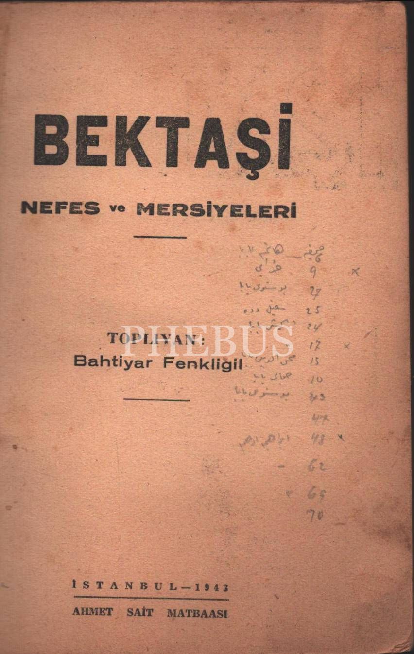 BEKTAŞİ Nefes ve Mersiyeleri, toplıyan: Bahtiyar Fenkligil, Ahmet Sait Matbaası, İstanbul - 1943, 75 sayfa, 12x17 cm