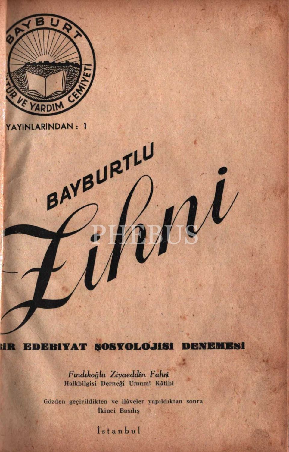 BAYBURTLU ZİHNİ, Ziyaeddin Fahri Fındıkoğlu, Bayburt Kültür ve Yardım Cemiyeti, İstanbul - 1950, 125 sayfa, 17x24 cm